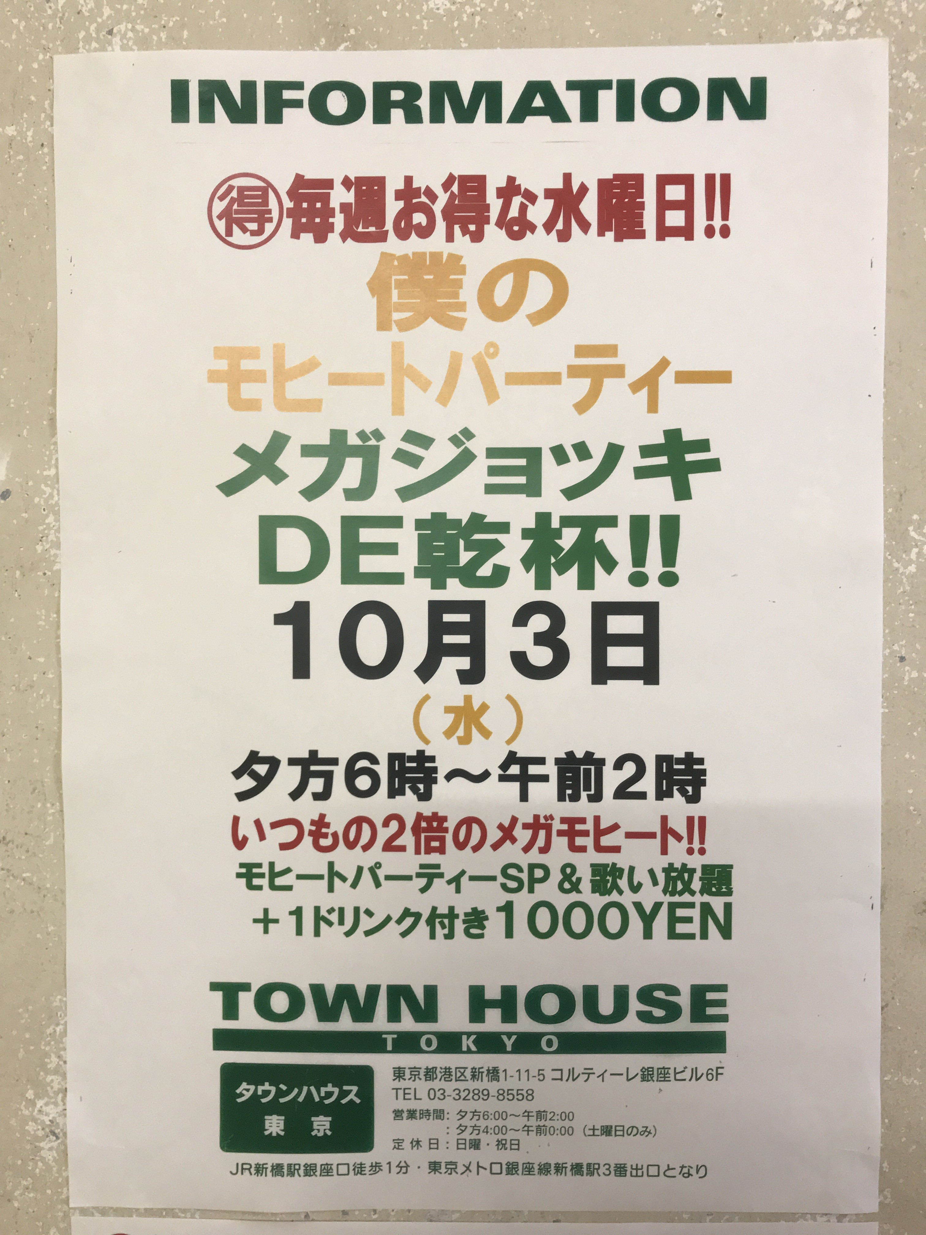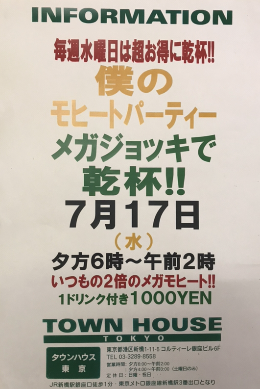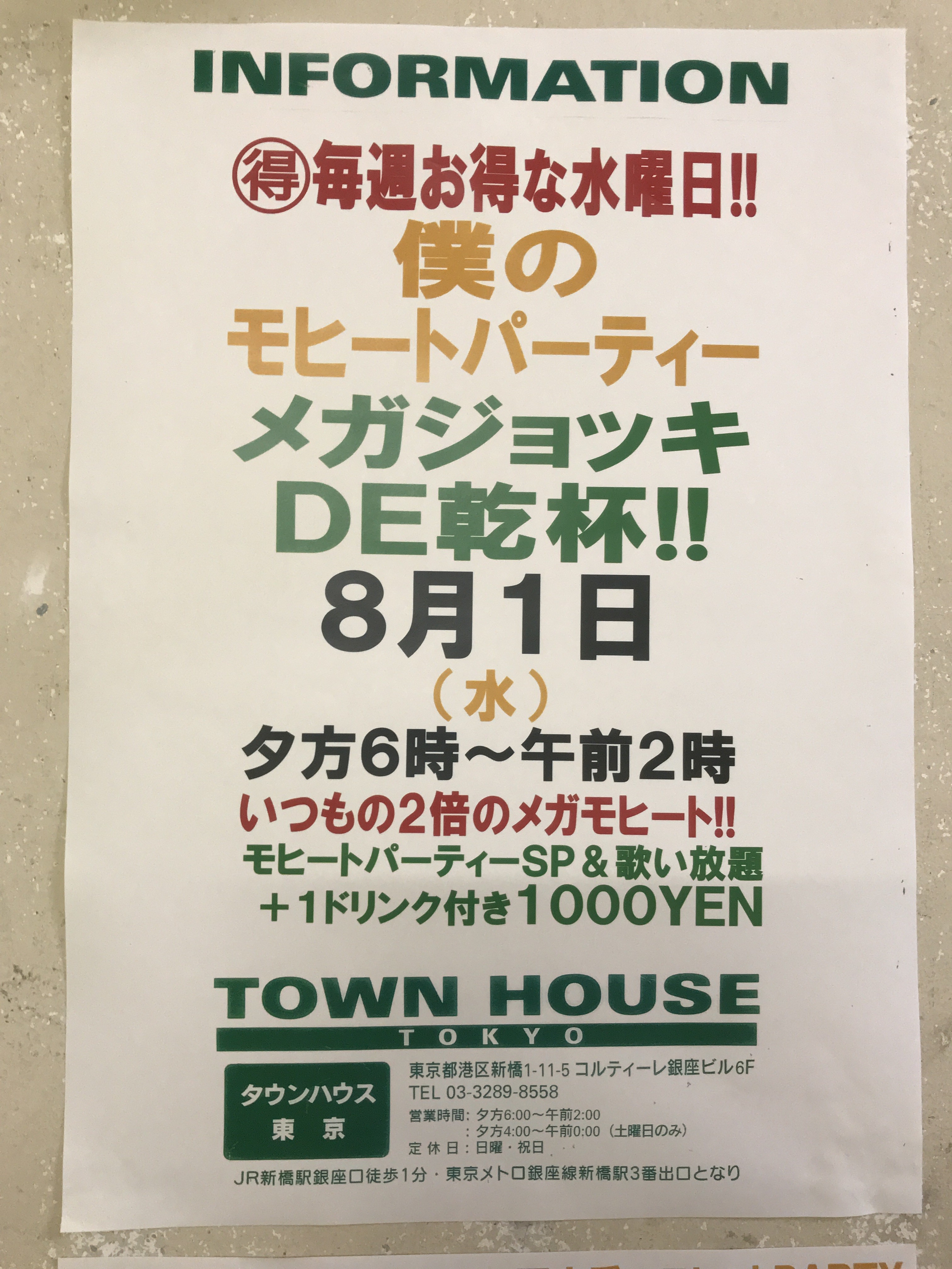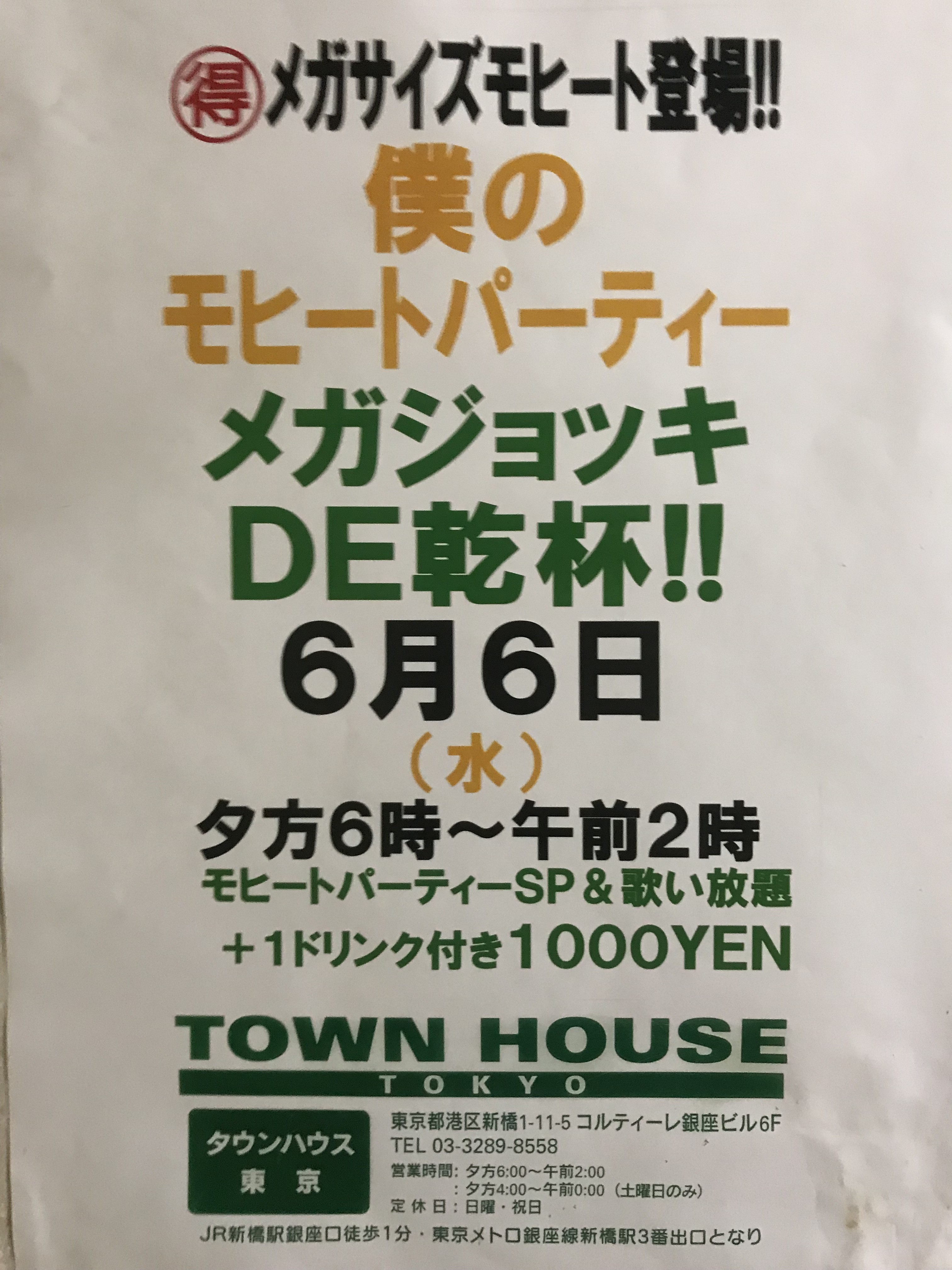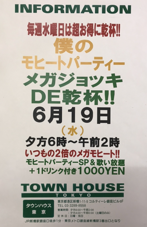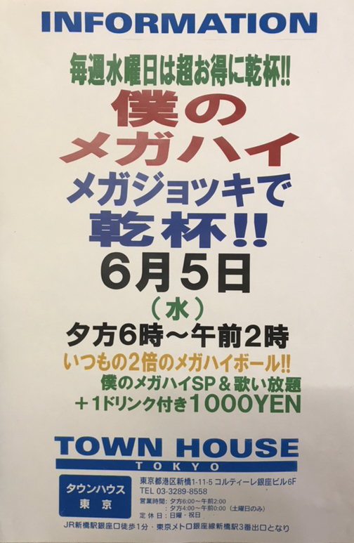今夜はノー残業で、タウンハウスへ、新橋へ。カラオケも無料の毎週水曜日のタウンハウス。メガジョッキモヒートで乾杯!! 龍二