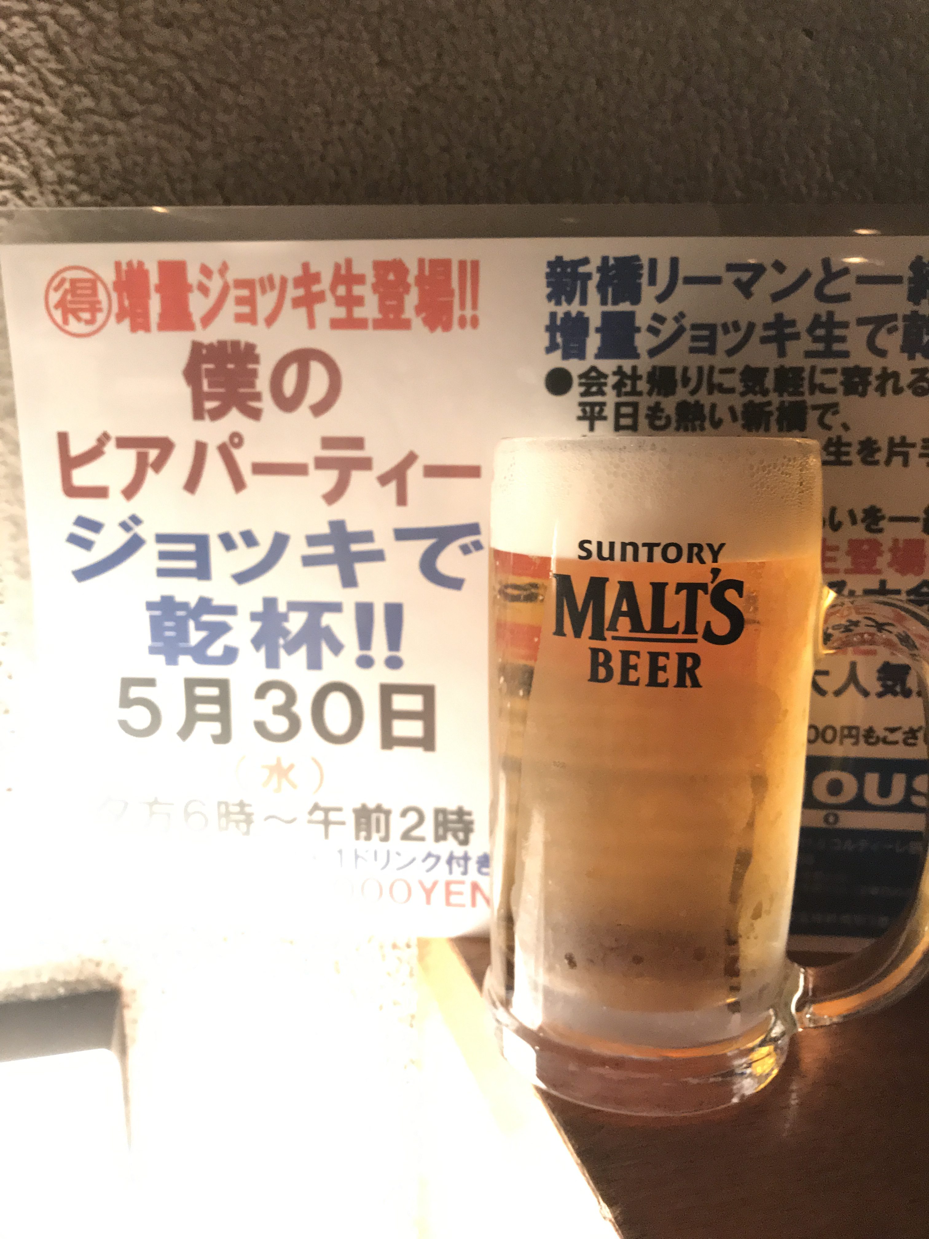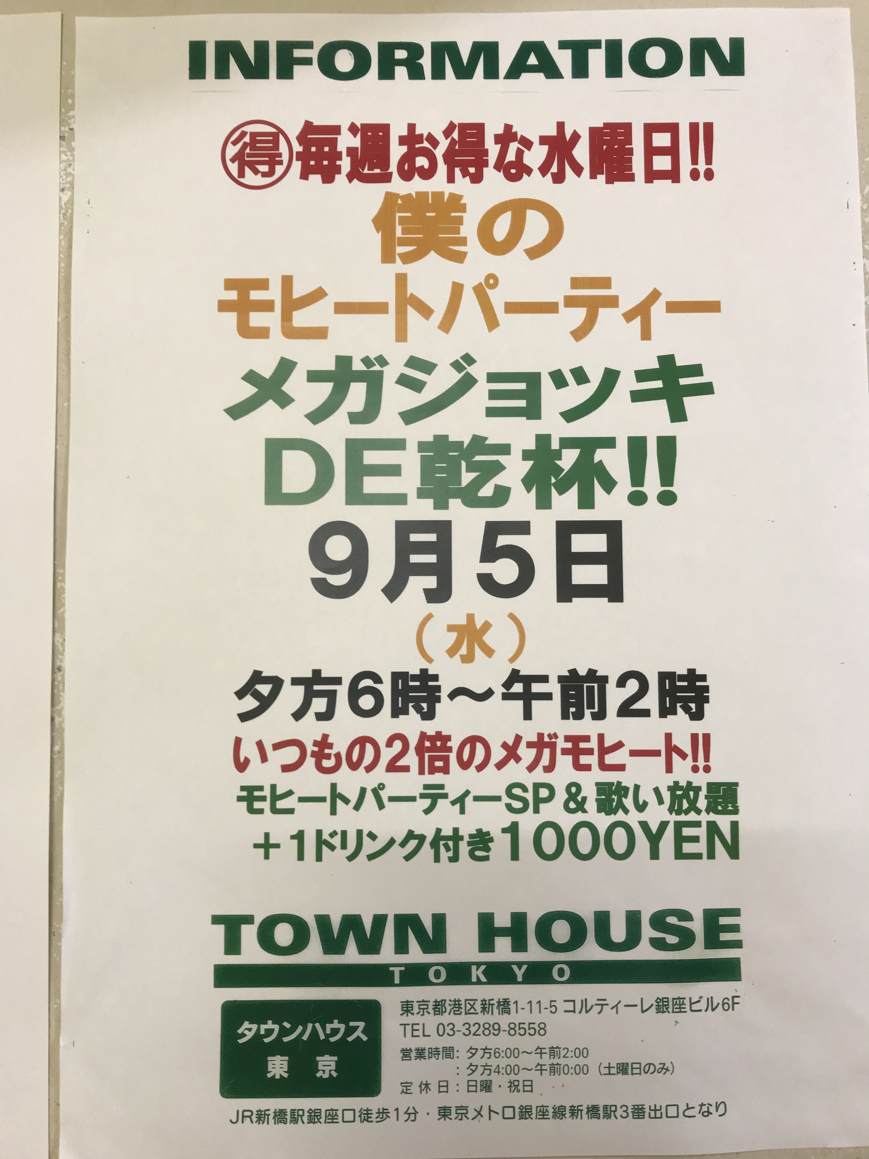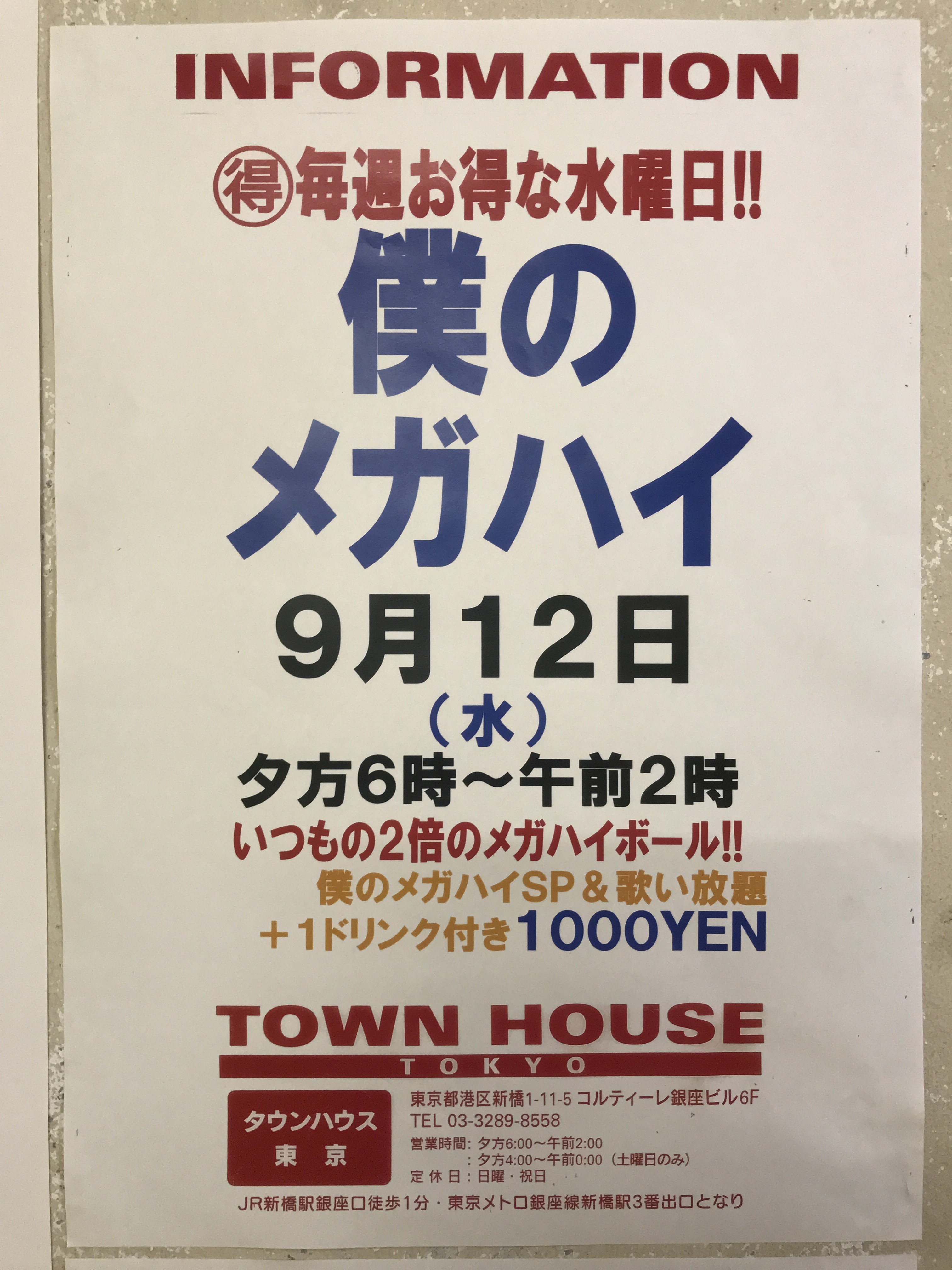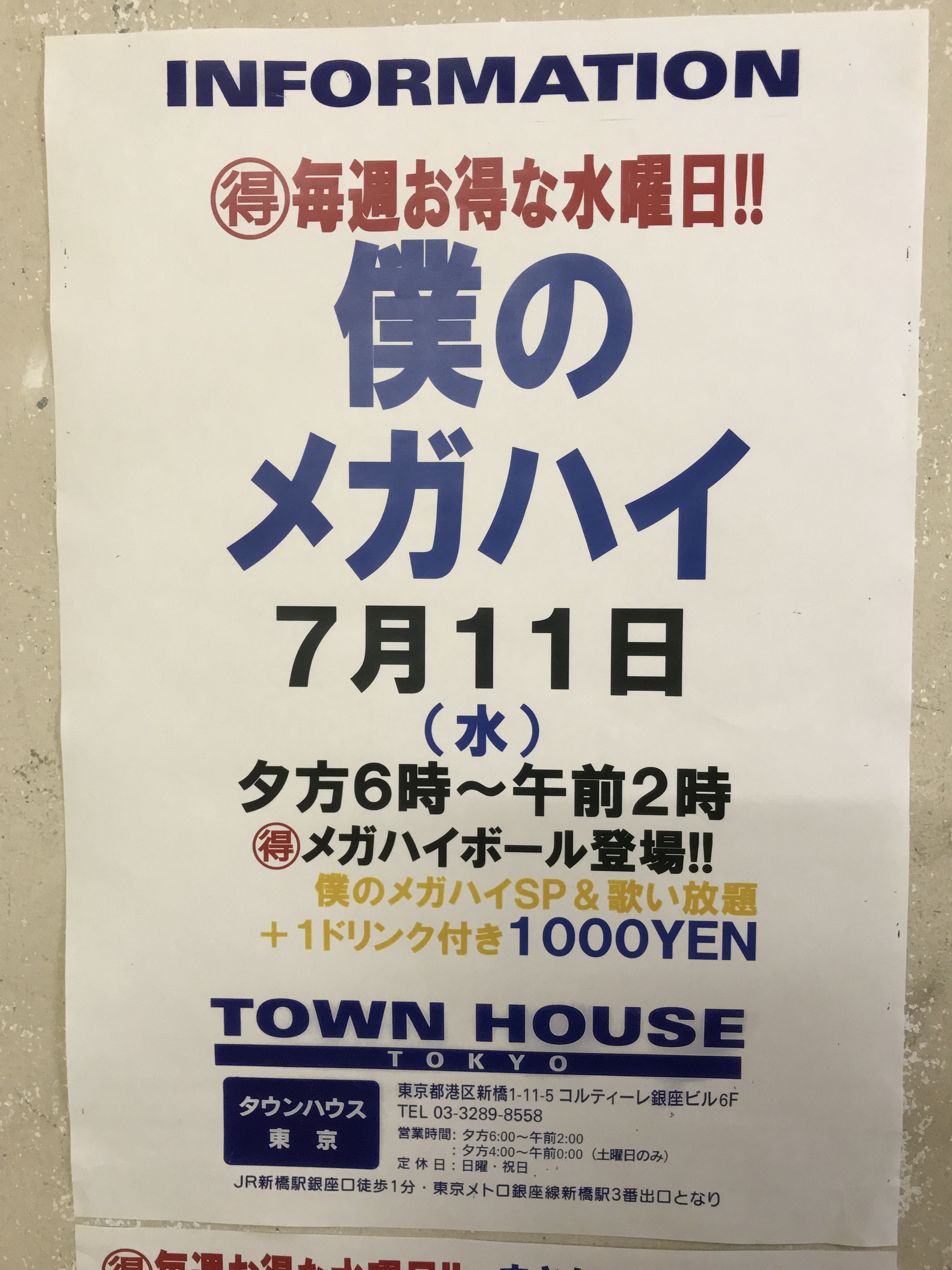 今夜はノー残業で、タウンハウスへ、新橋へ。カラオケも無料の毎週水曜日のタウンハウス。メガジョッキモヒートで乾杯!! 龍二