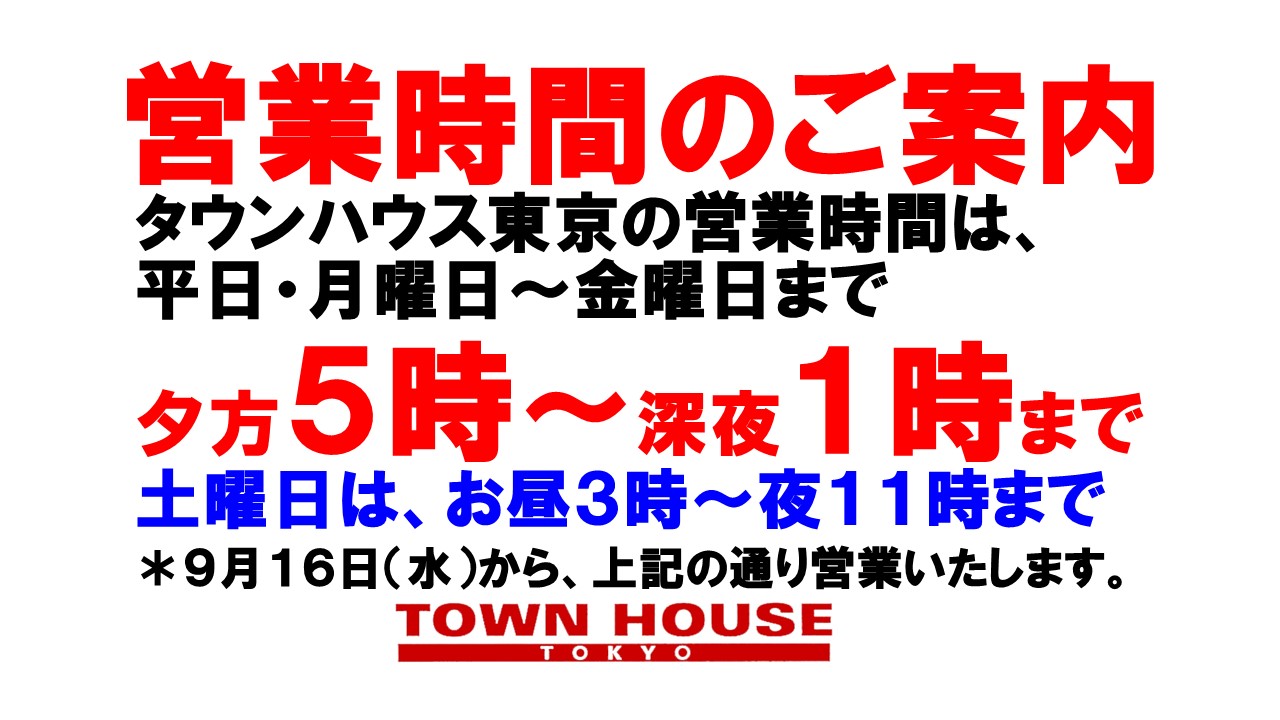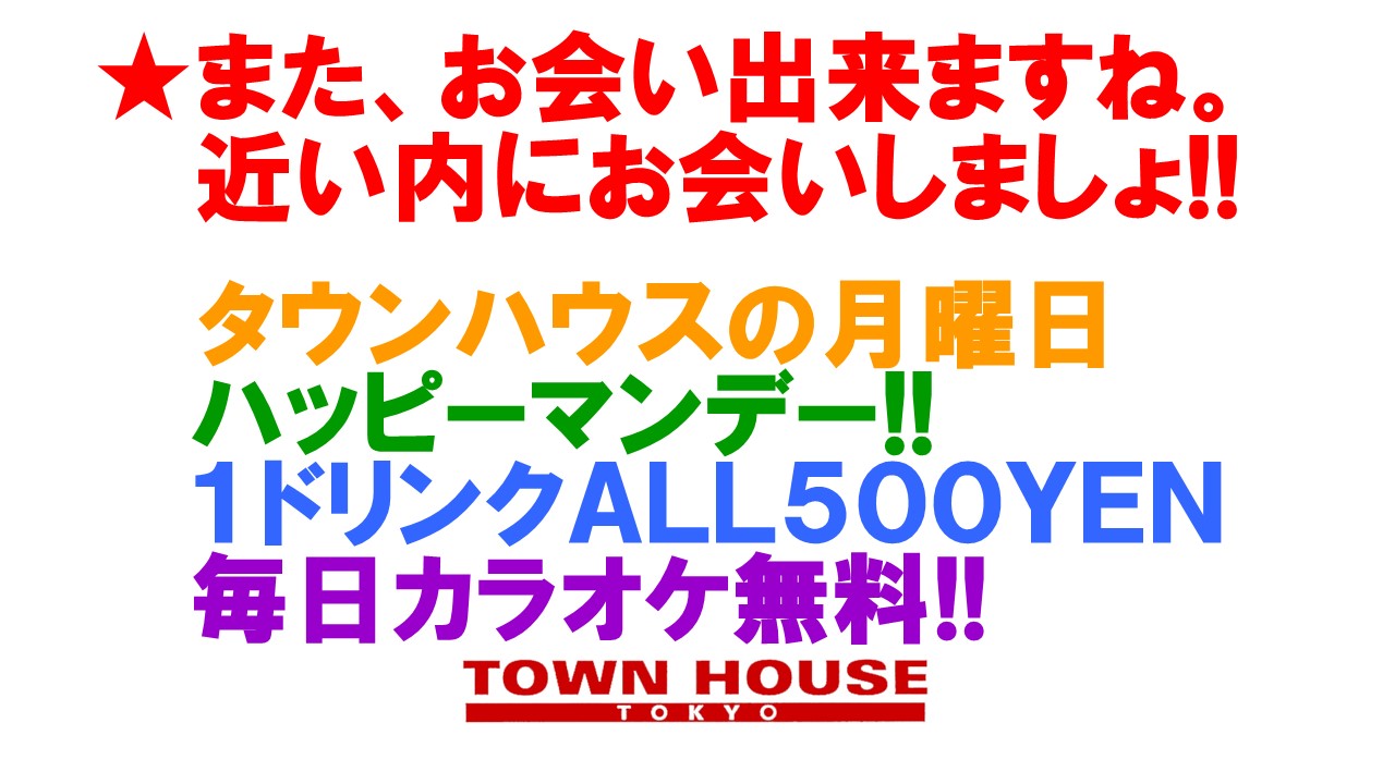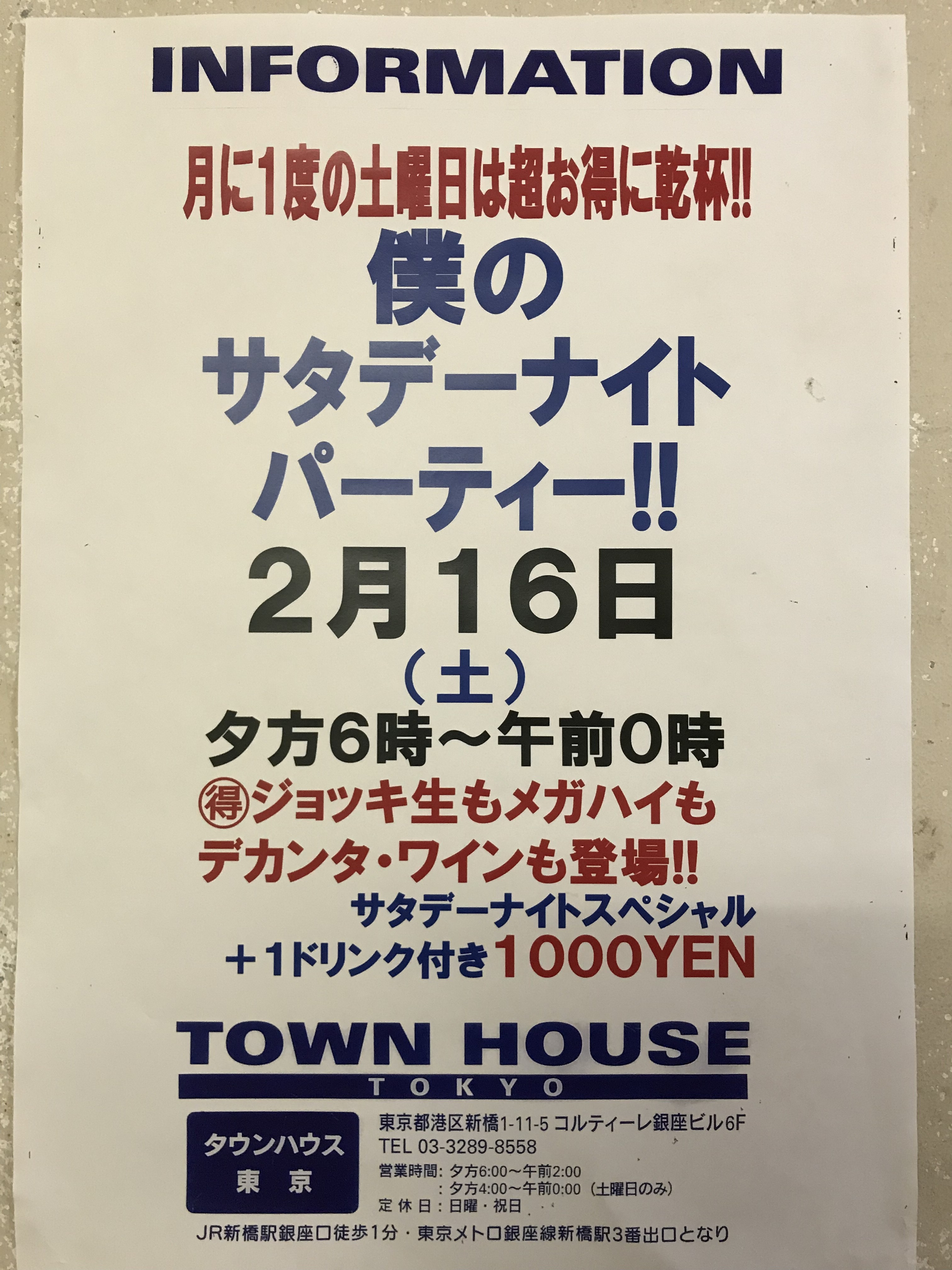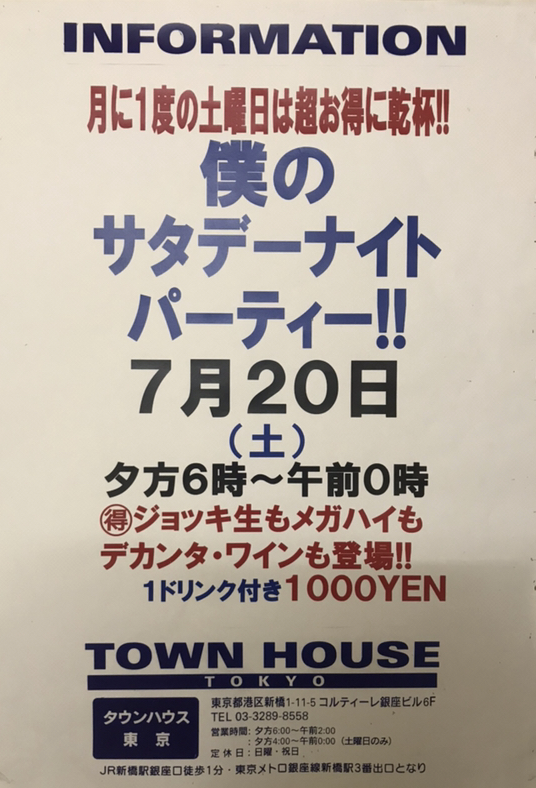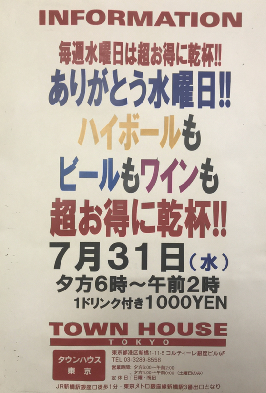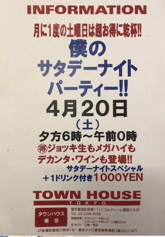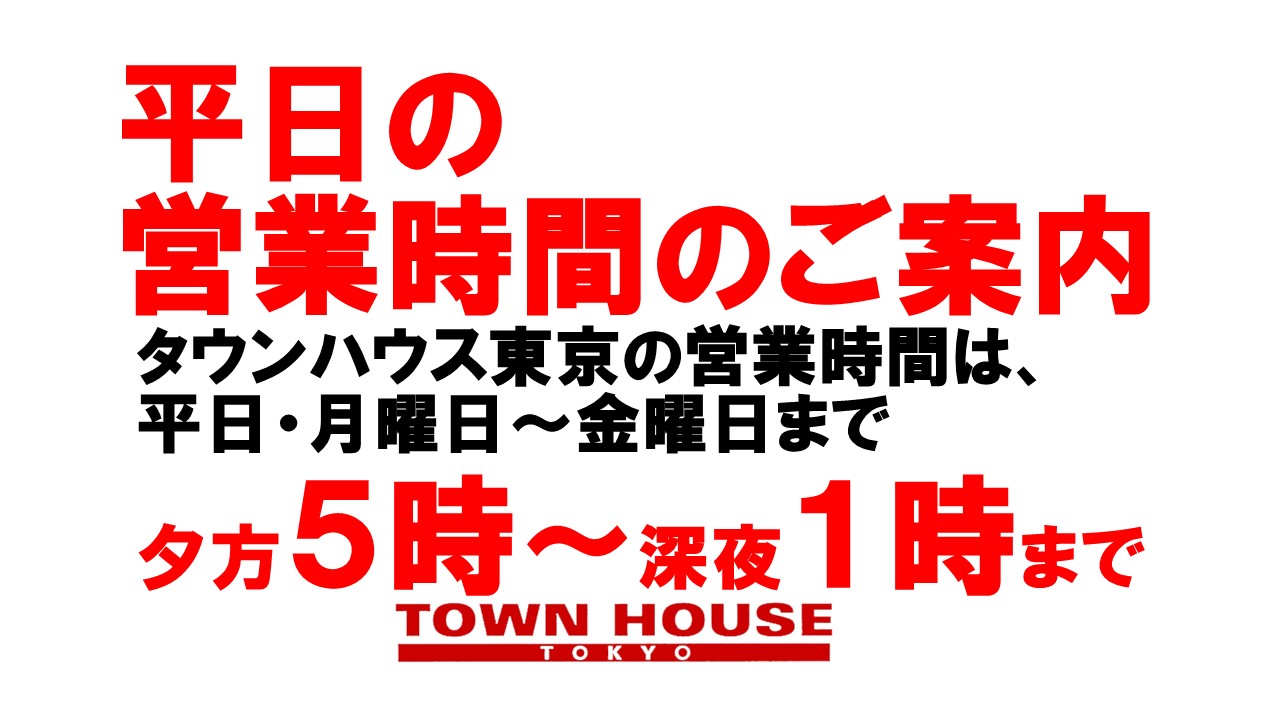 只今、午後2時。お昼休みの後、ちょっと眠くなってくる昼下がり。もうひと頑張りして、今夜は、是非、NO残業で、タウンハウスへ、新橋へ。
