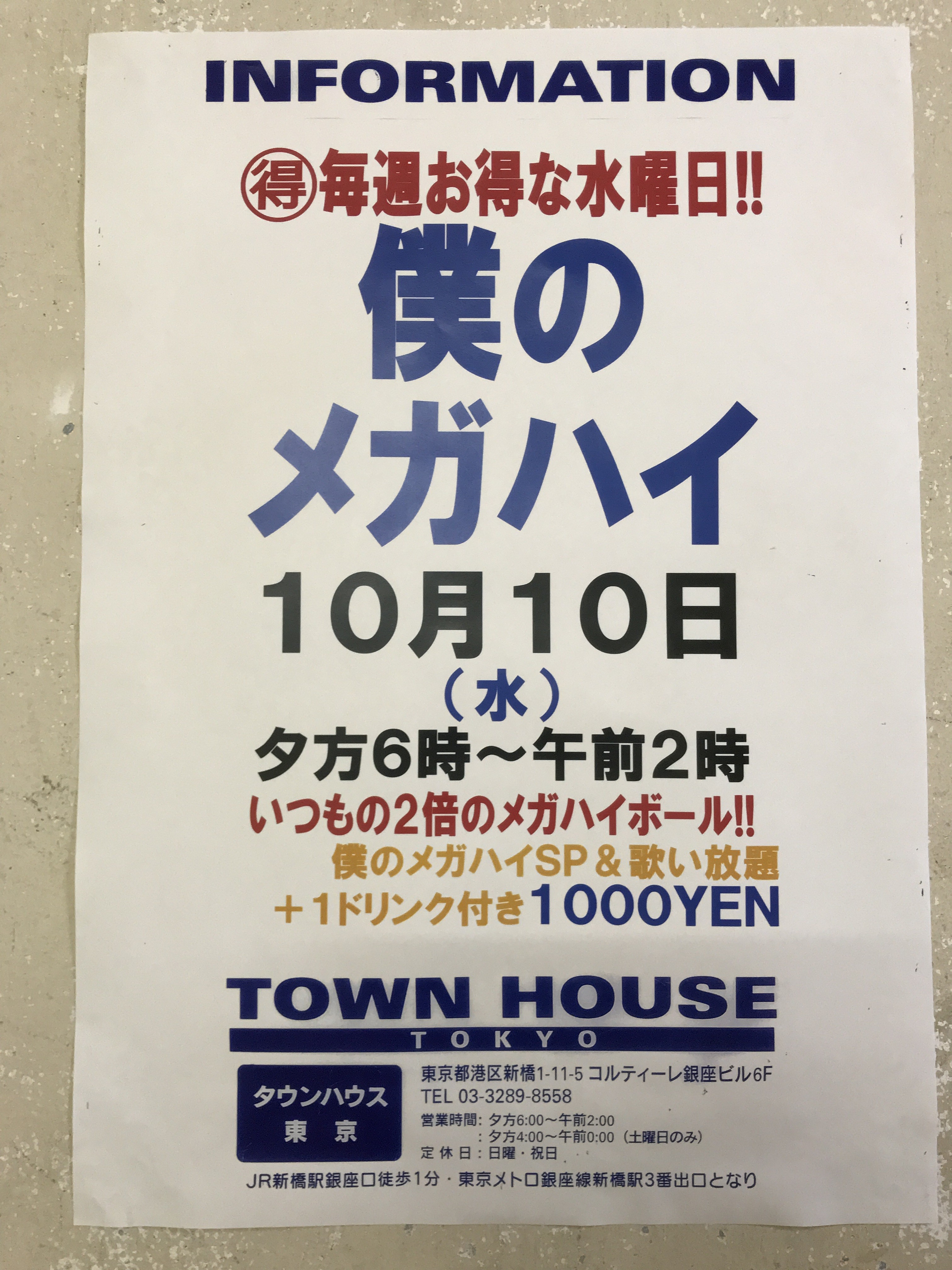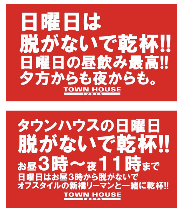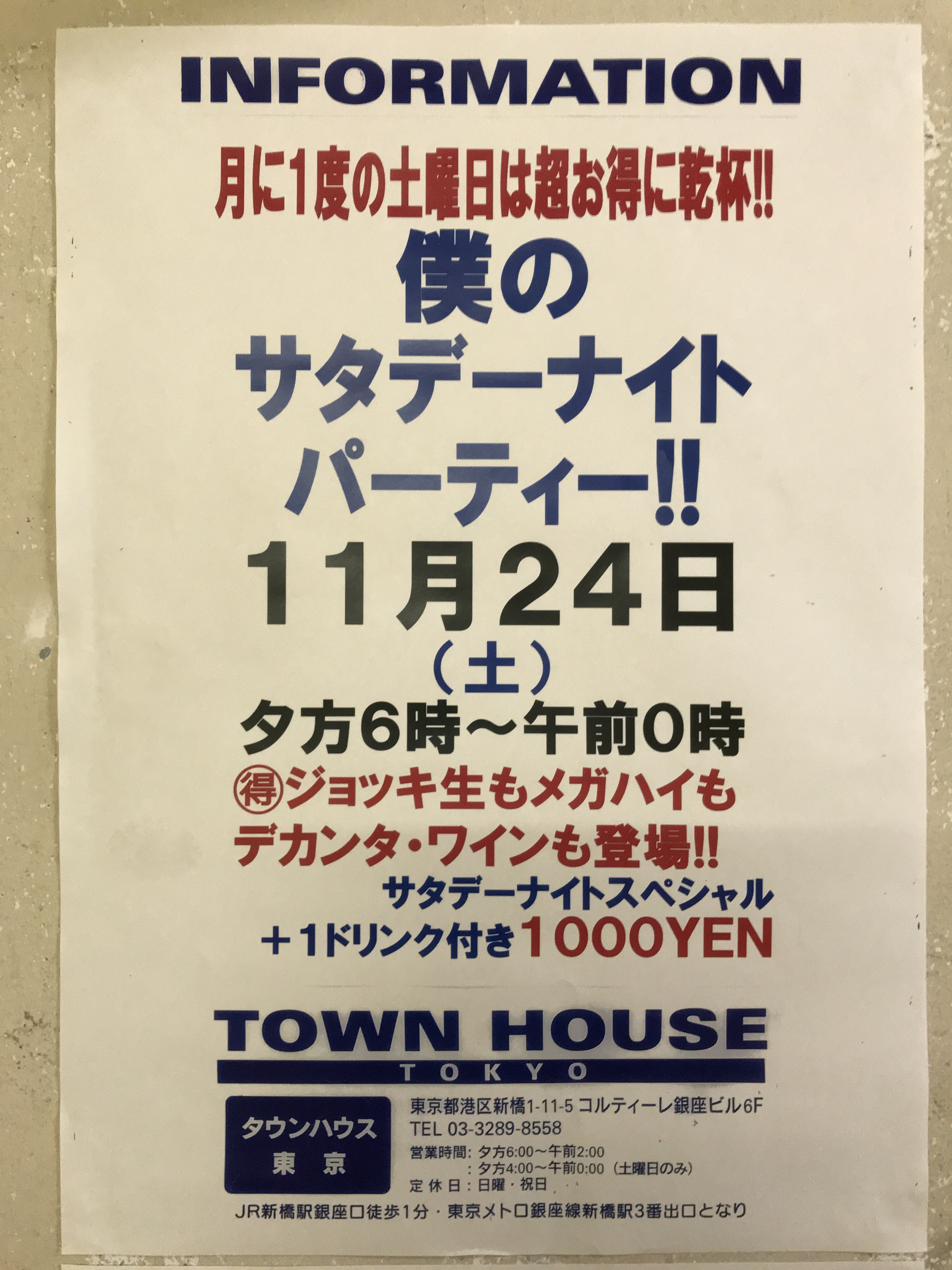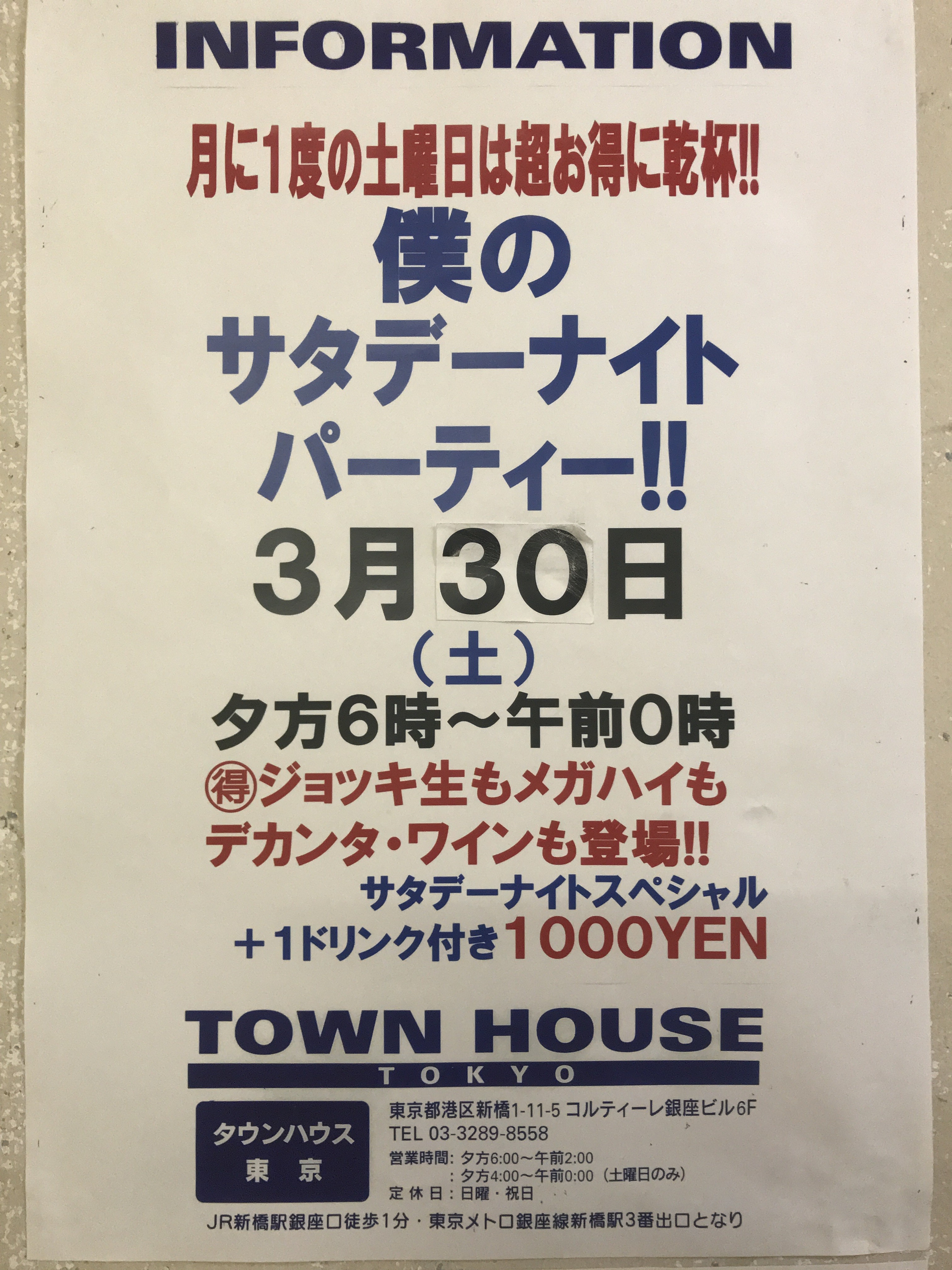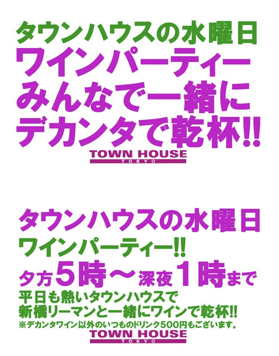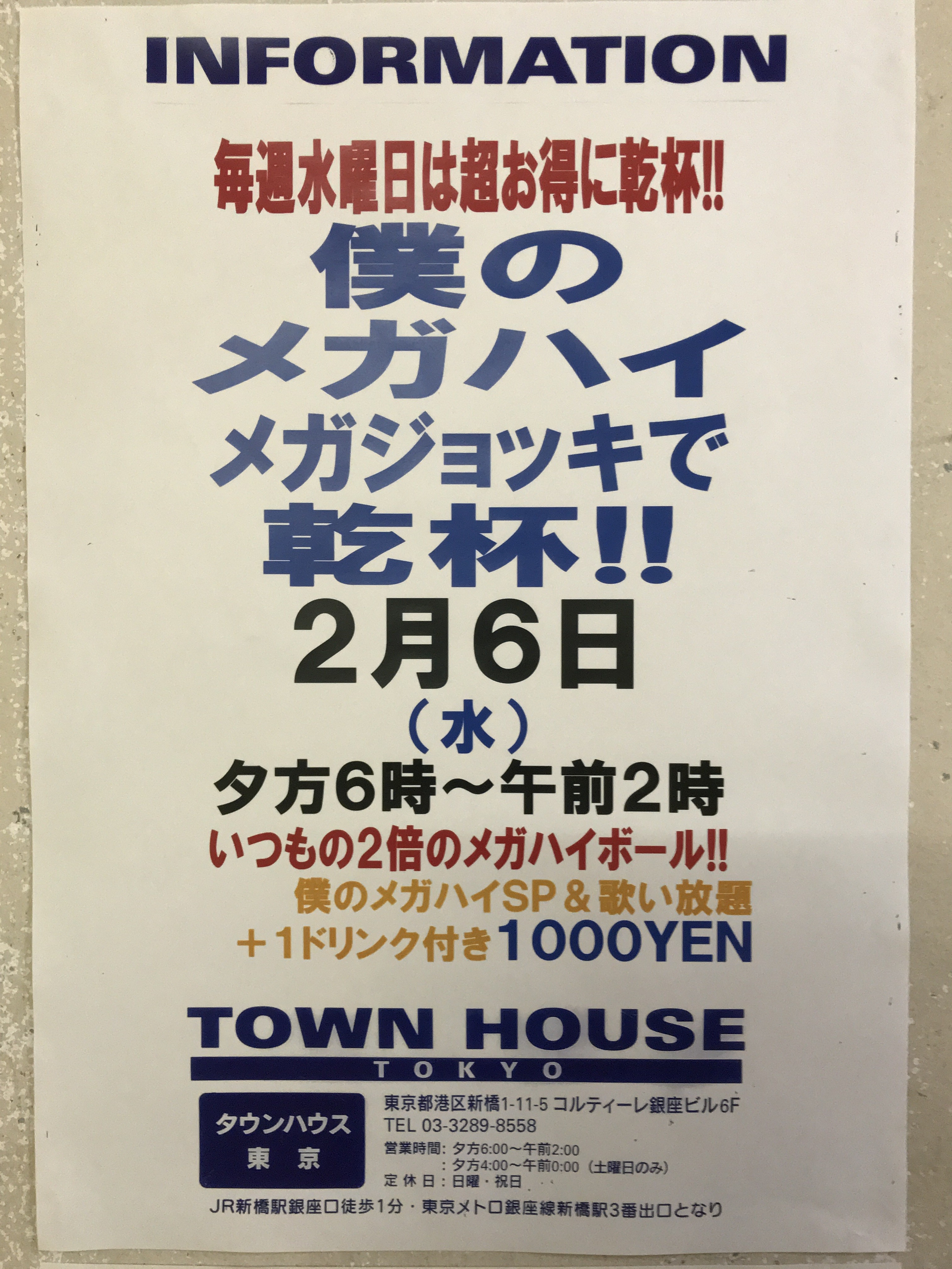 只今、午後2時。お昼休みの後、ちょっと眠くなってくる昼下がり。もうひと頑張りして、今夜は、是非、NO残業で、タウンハウスへ、新橋へ。