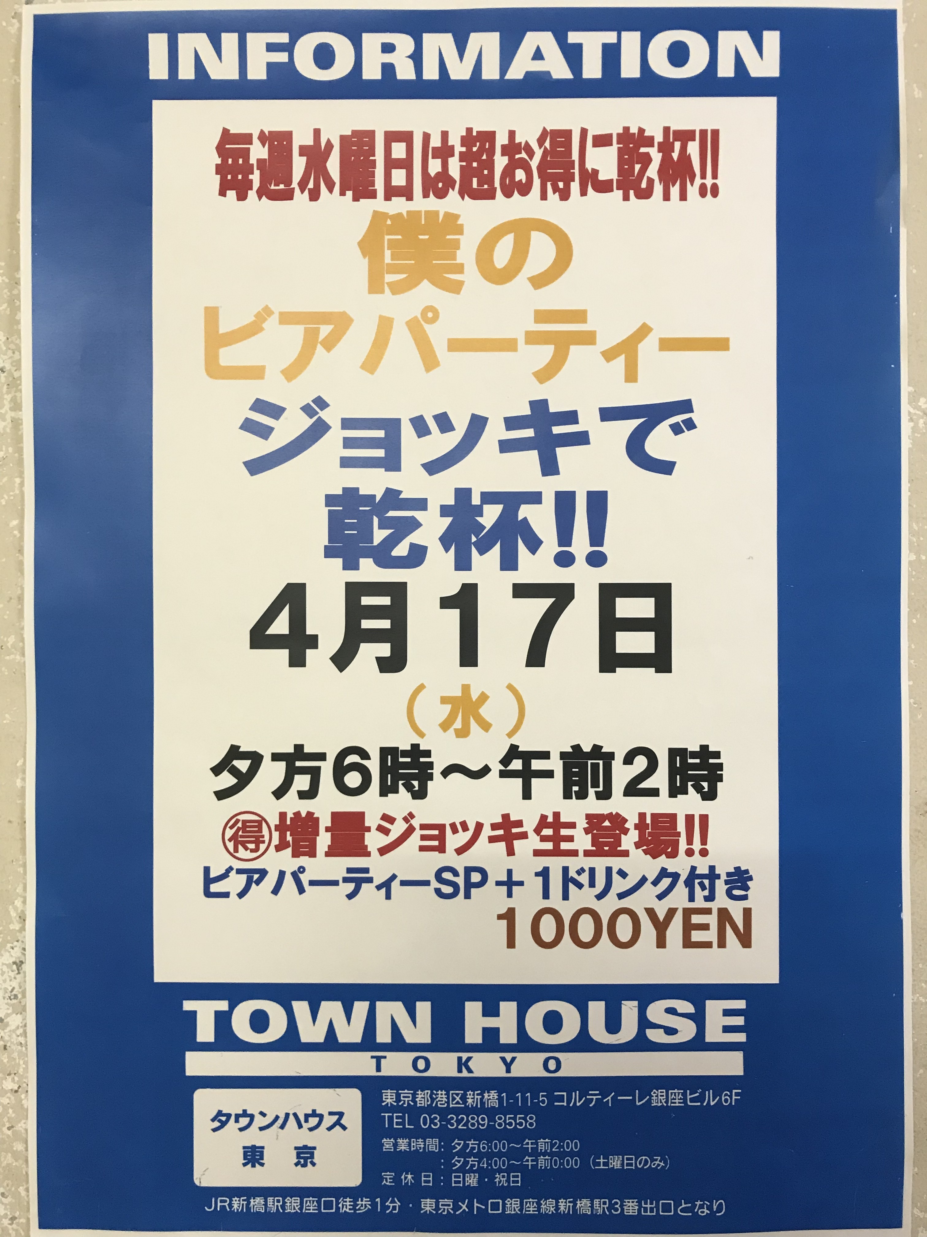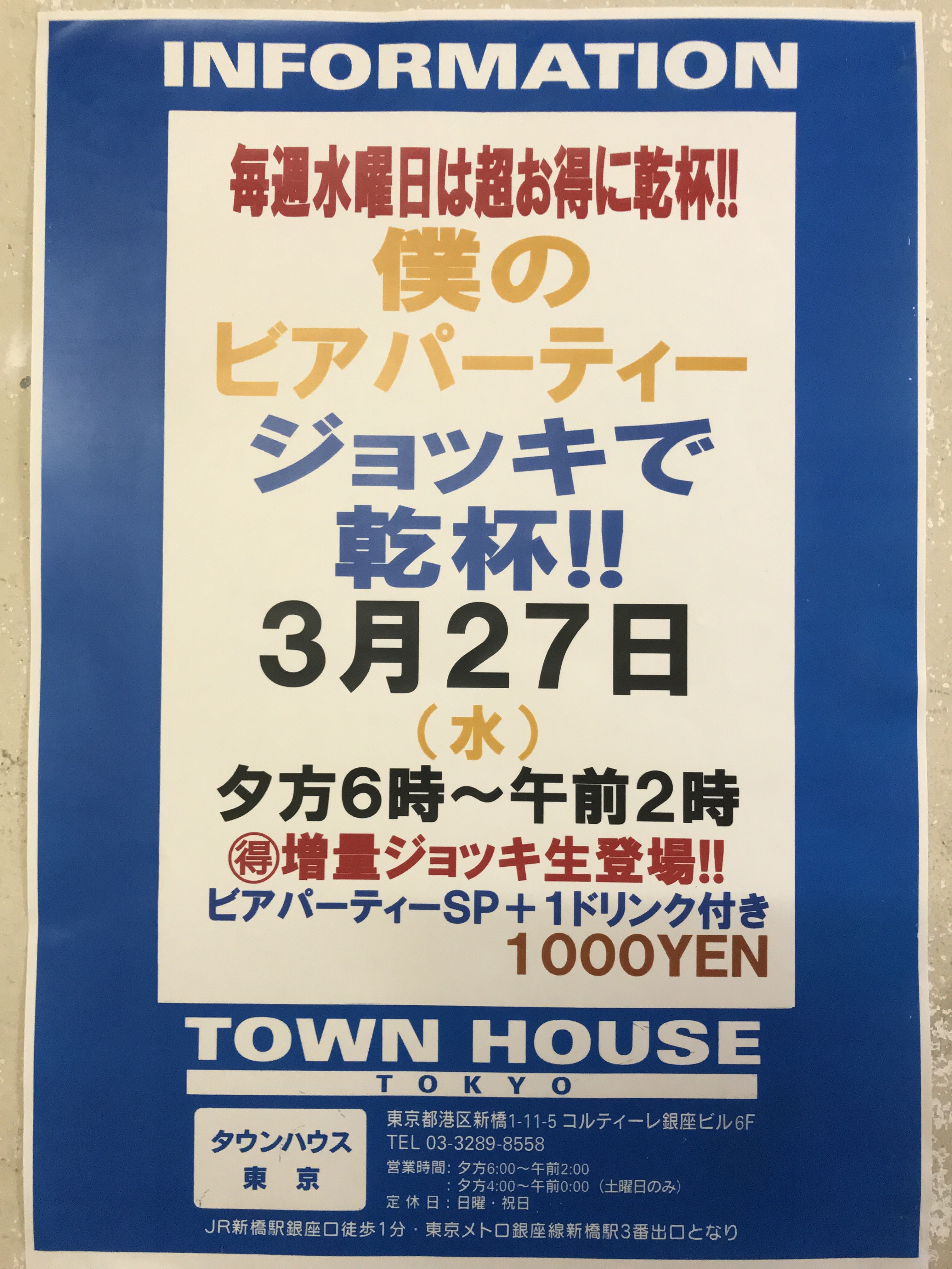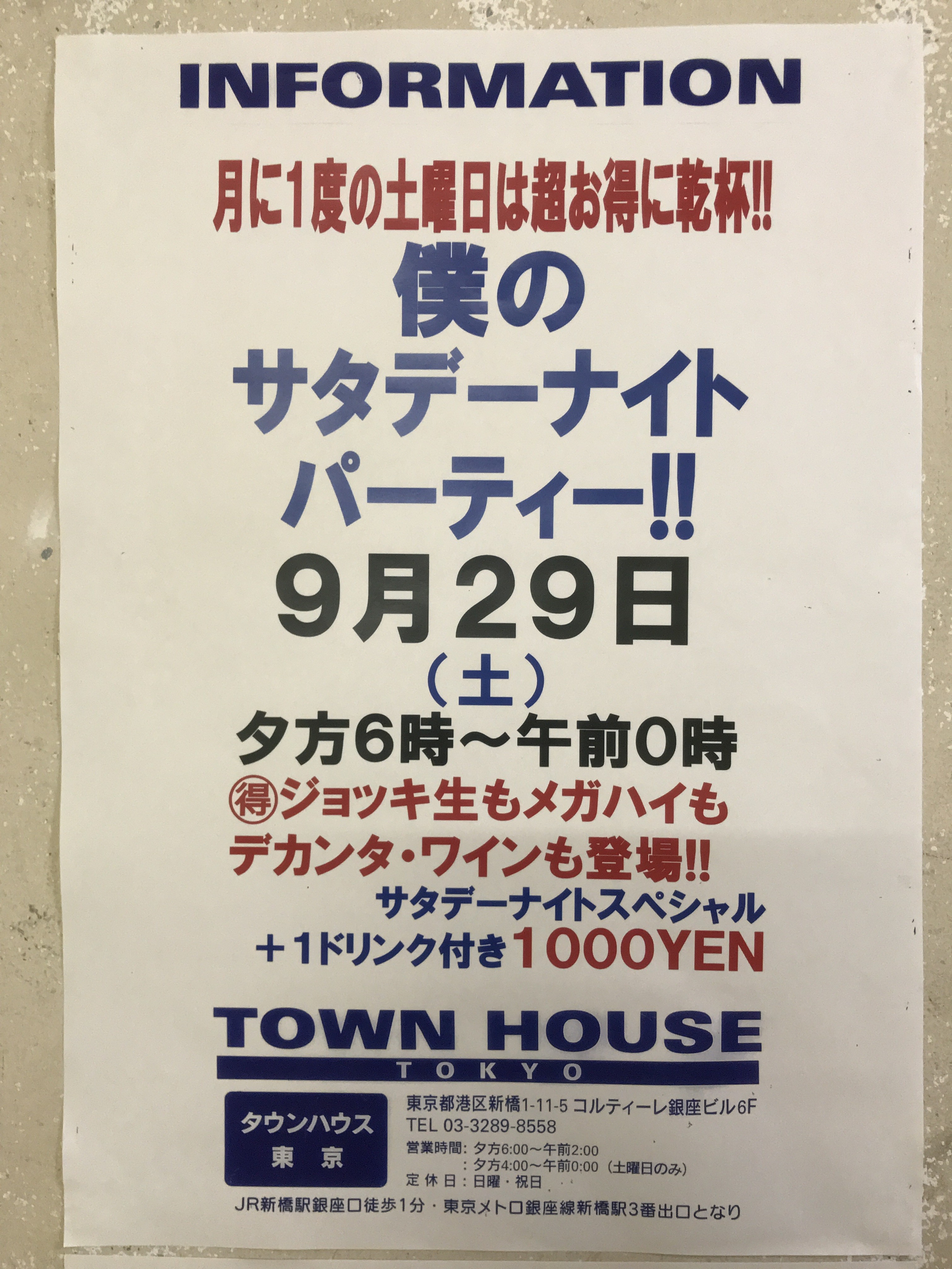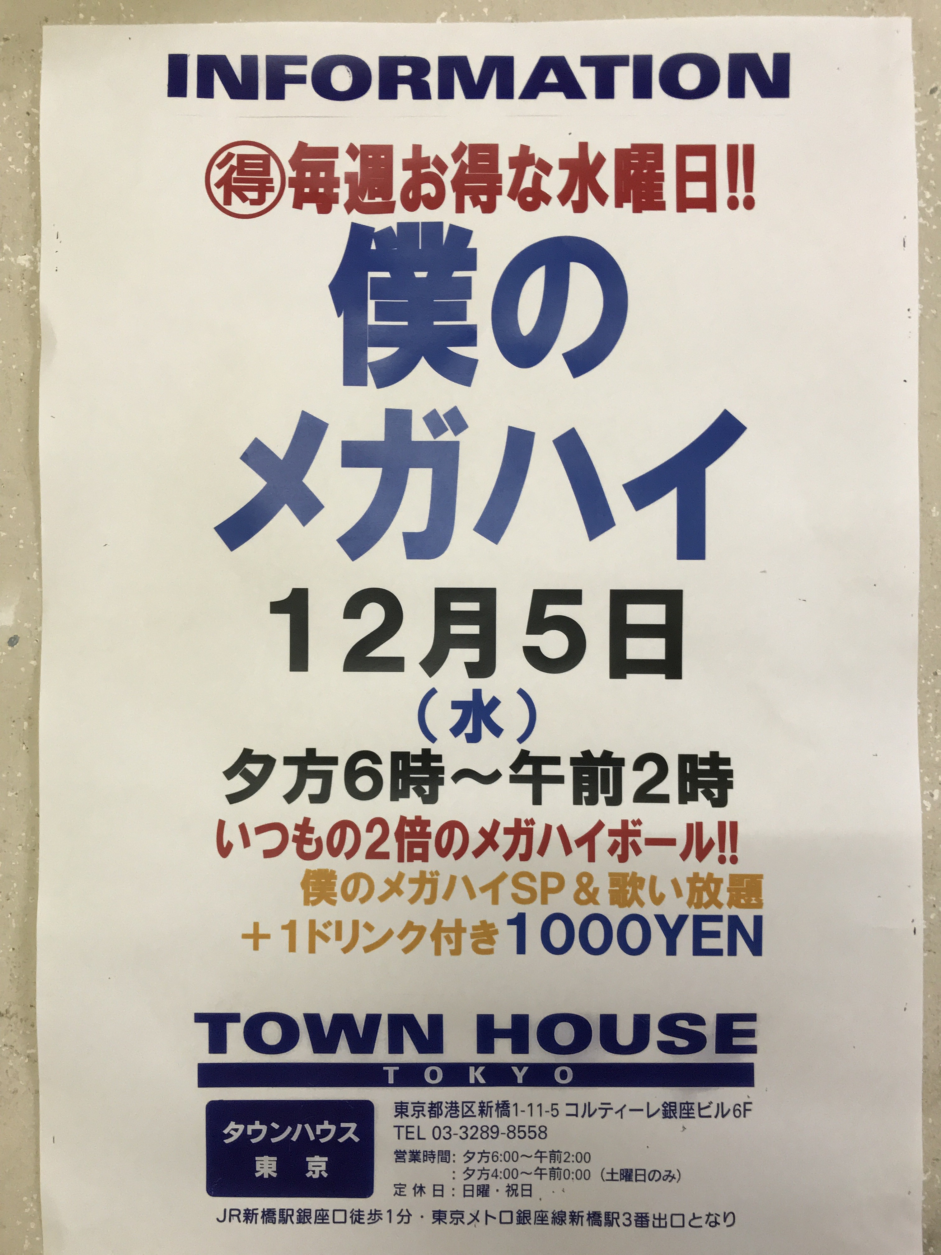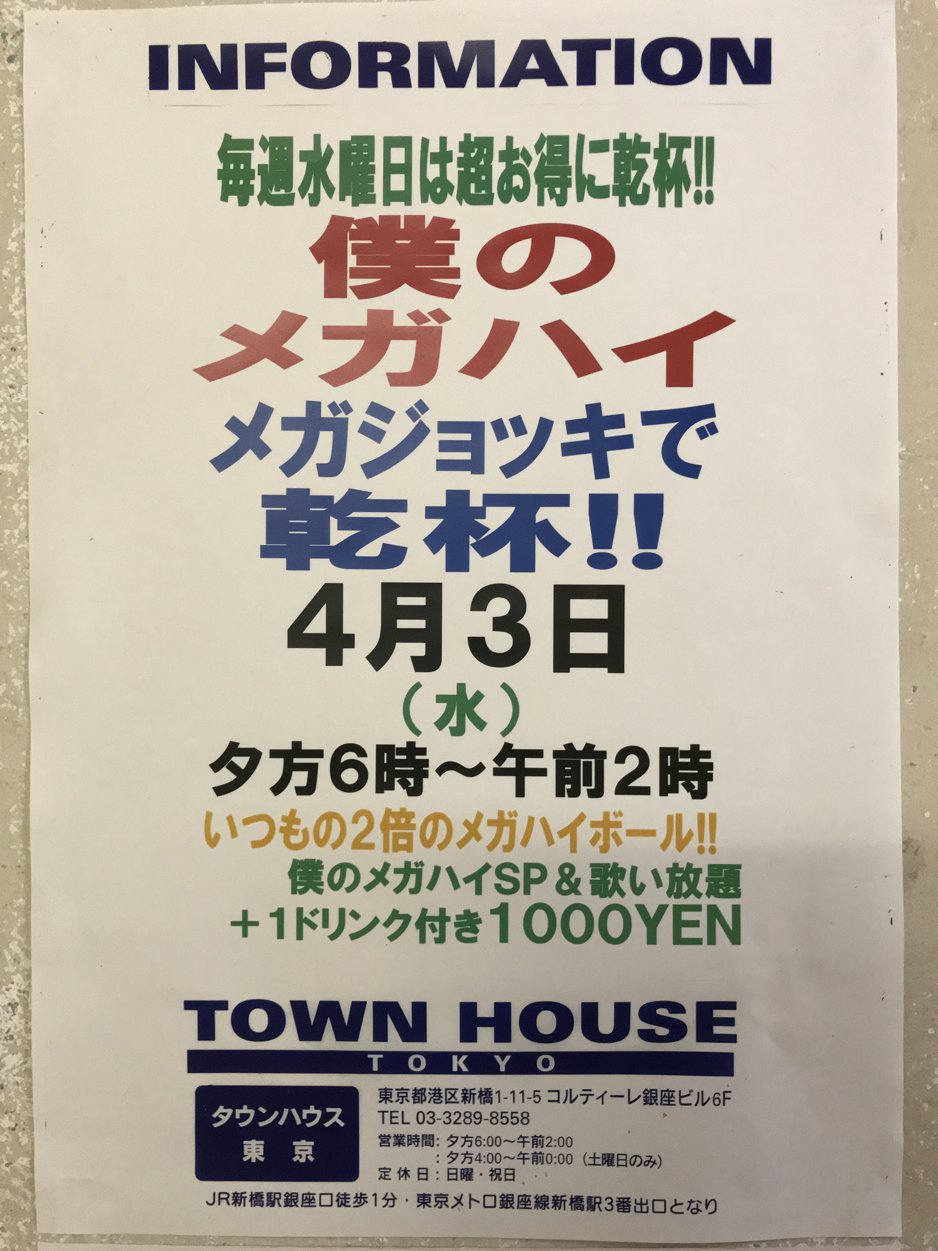 只今、午後2時。お昼休みの後、ちょっと眠くなってくる昼下がり。もうひと頑張りして、今夜は、是非、NO残業で、タウンハウスへ、新橋へ。