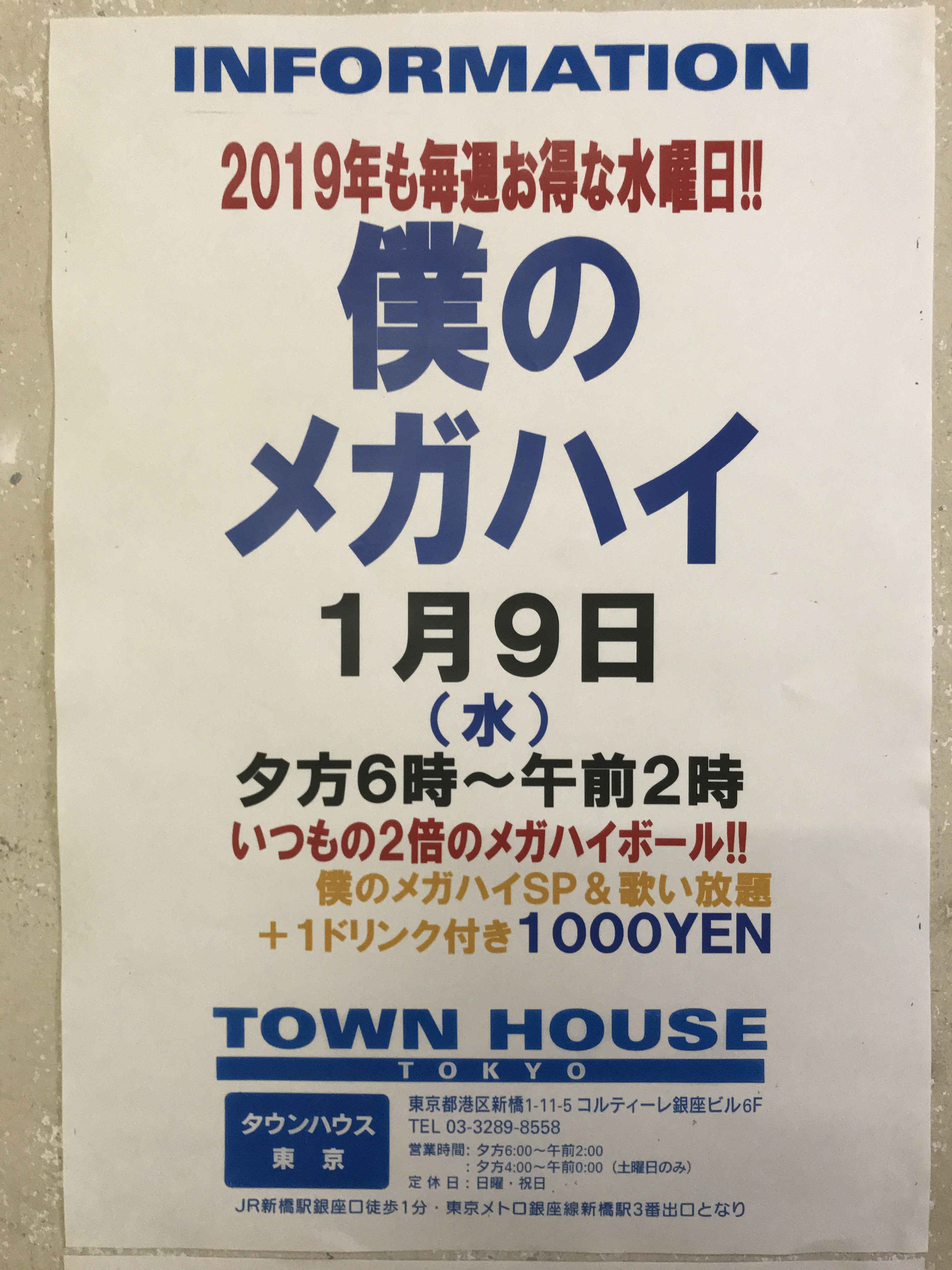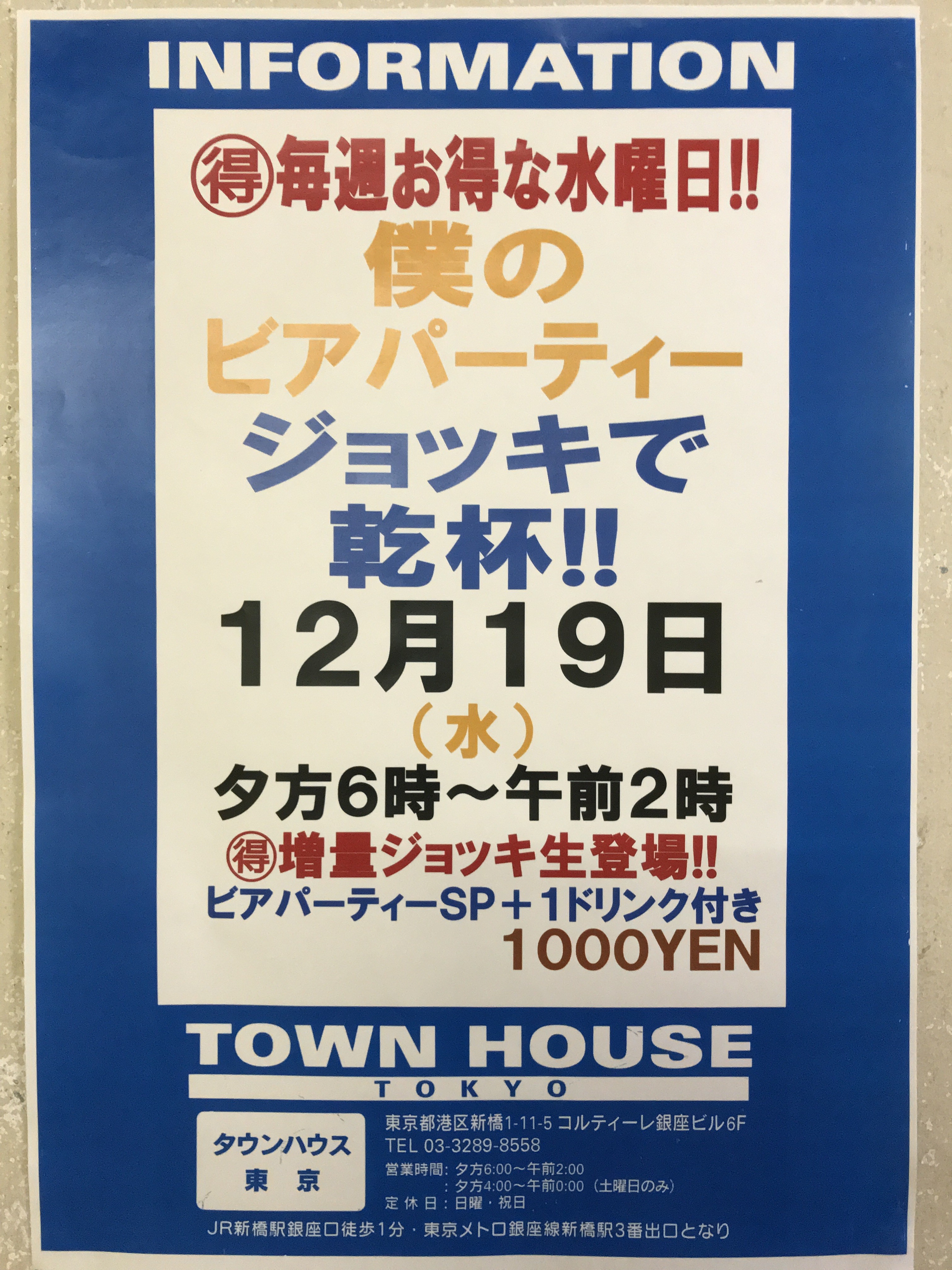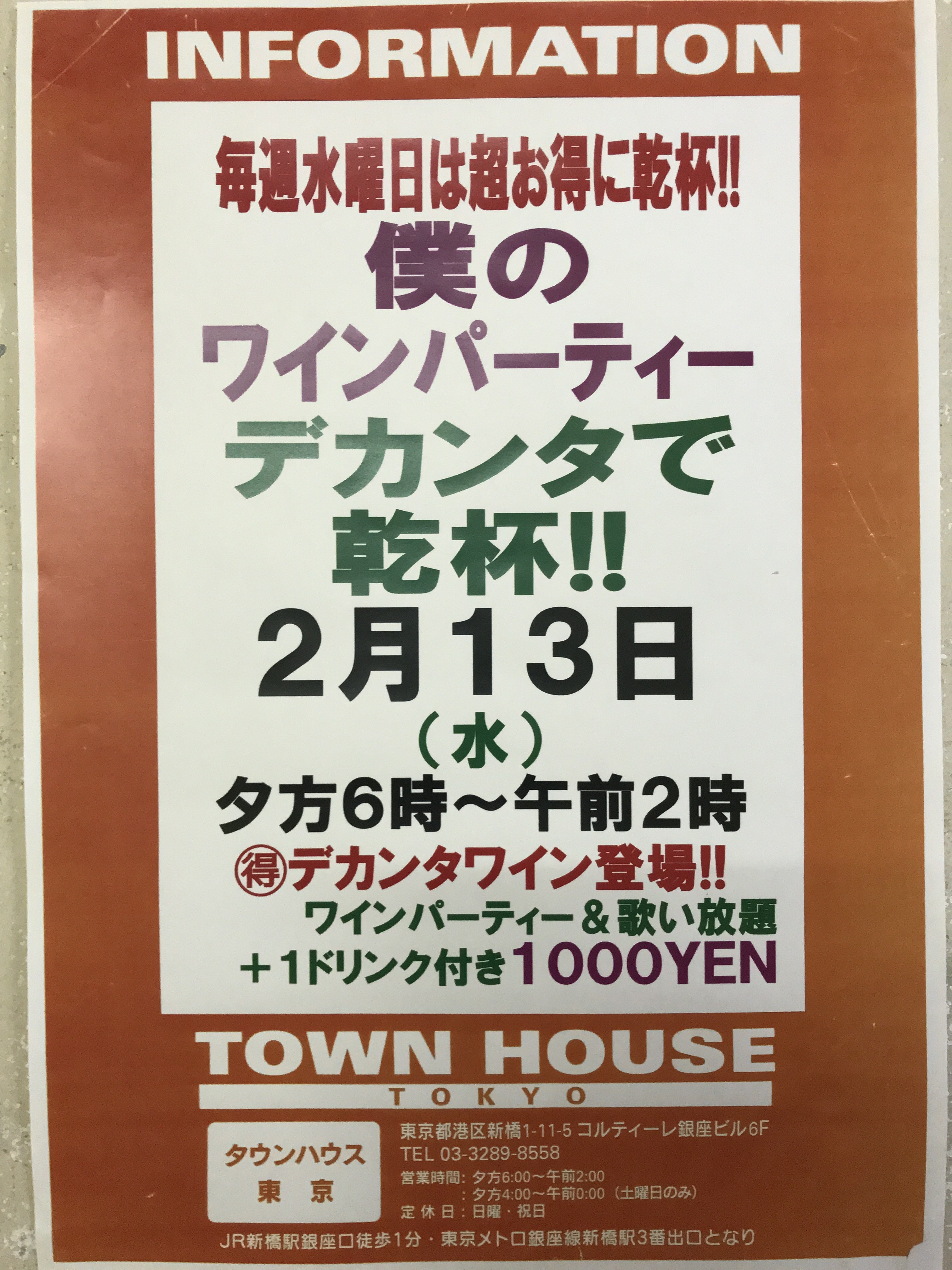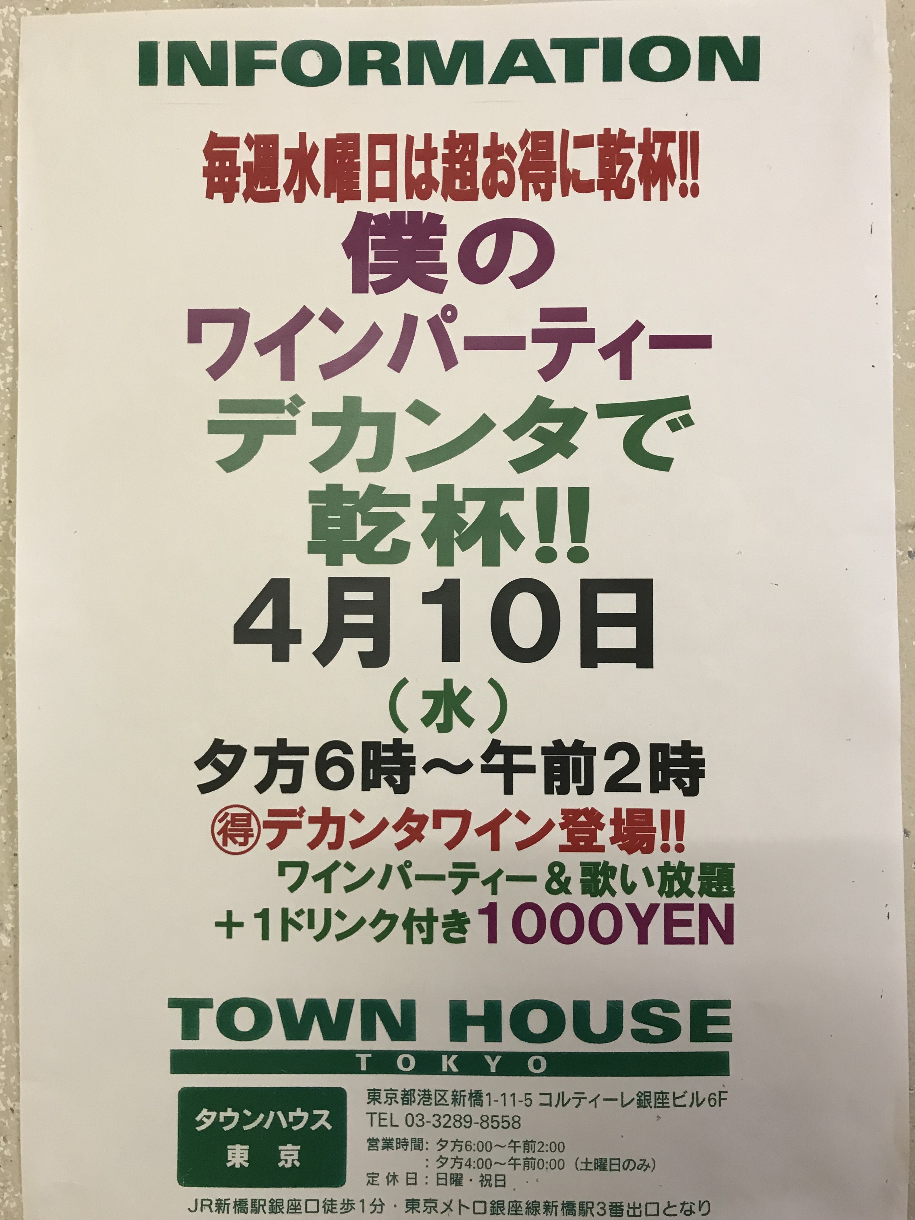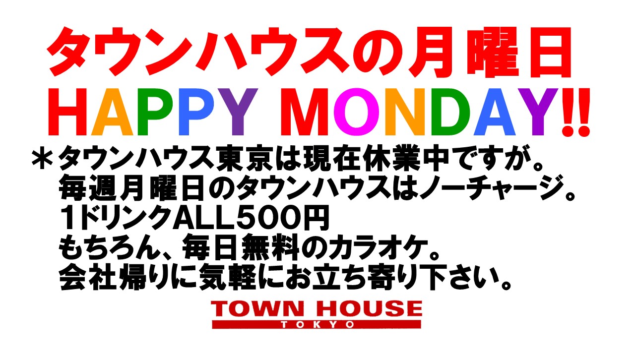 只今、午後2時。お昼休みの後、ちょっと眠くなってくる昼下がり。もうひと頑張りして、今夜は、是非、NO残業で、タウンハウスへ、新橋へ。