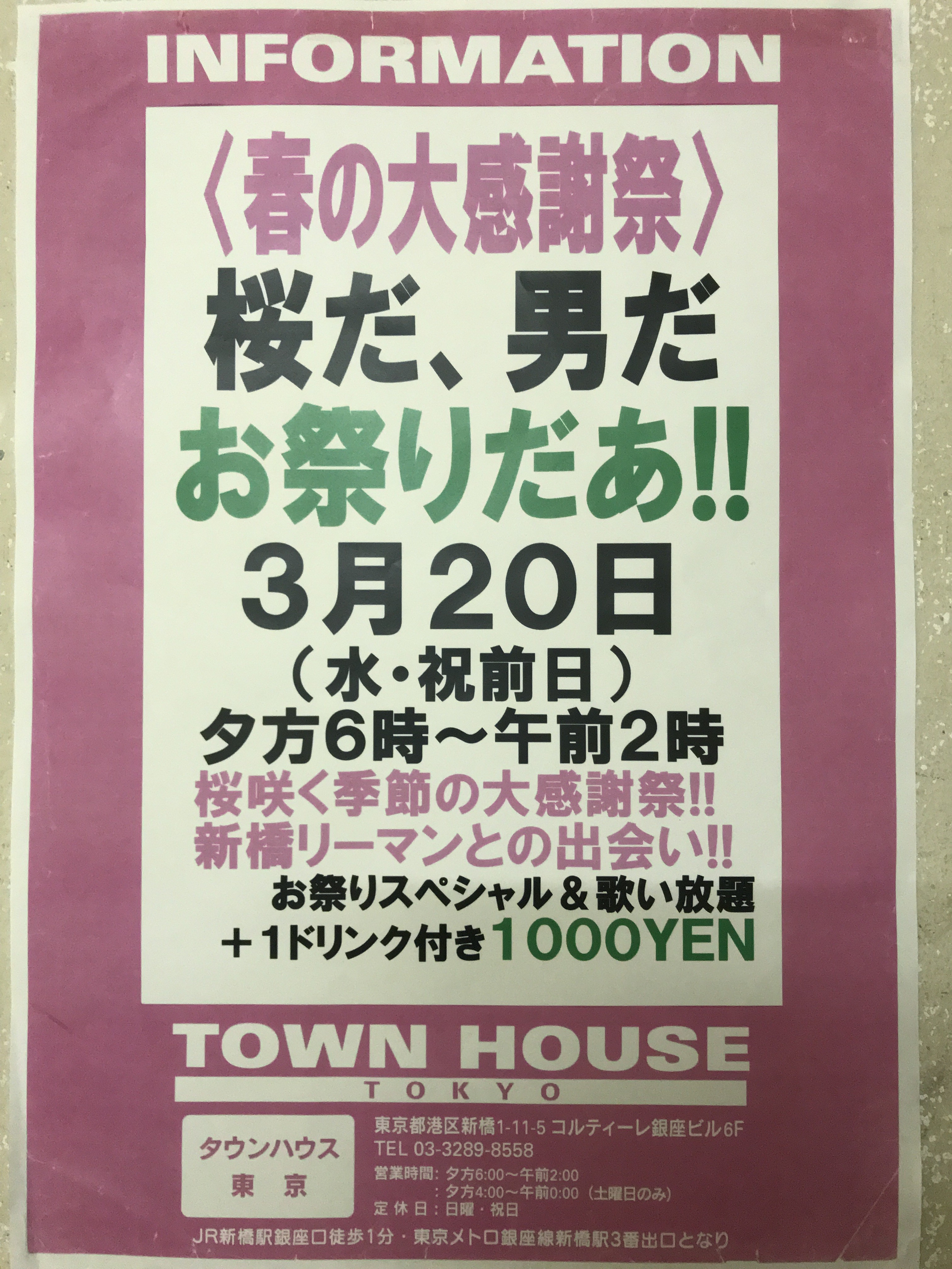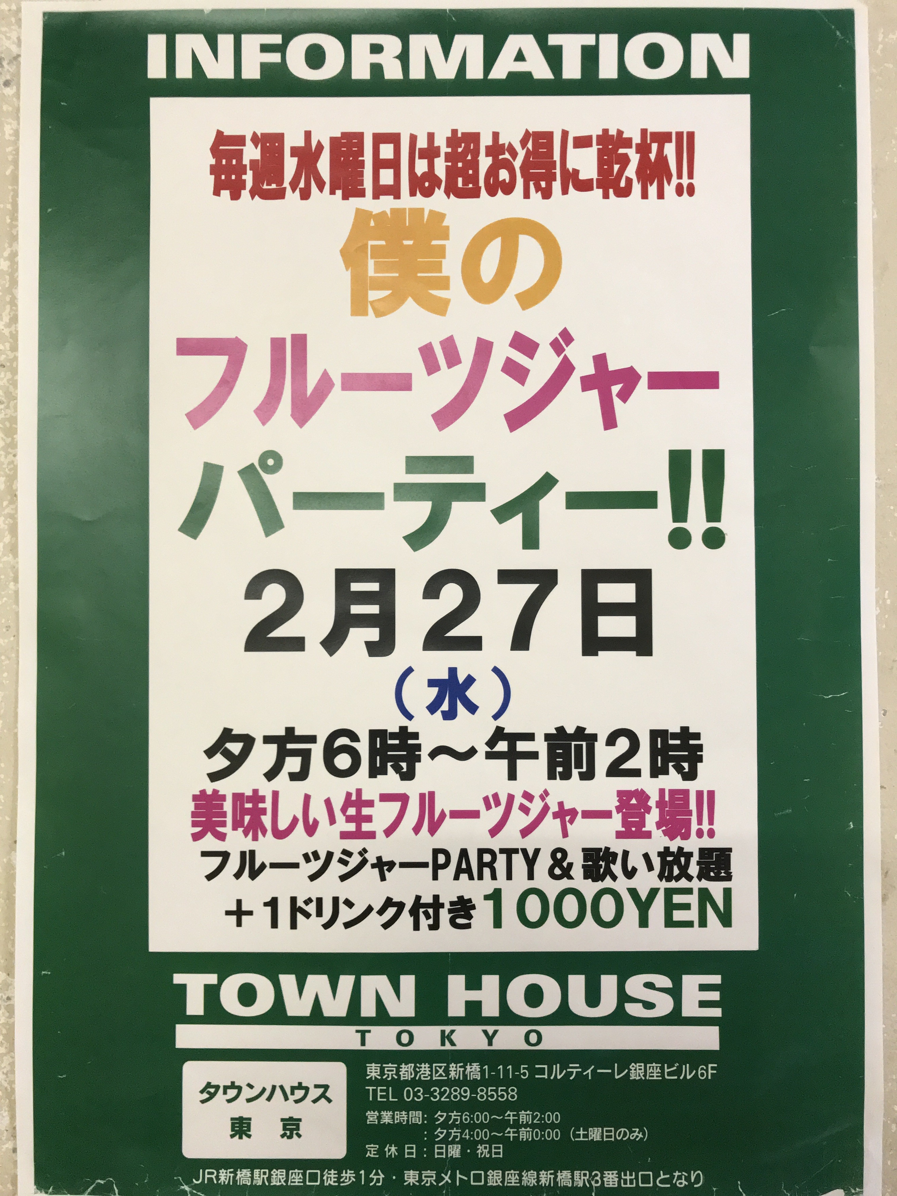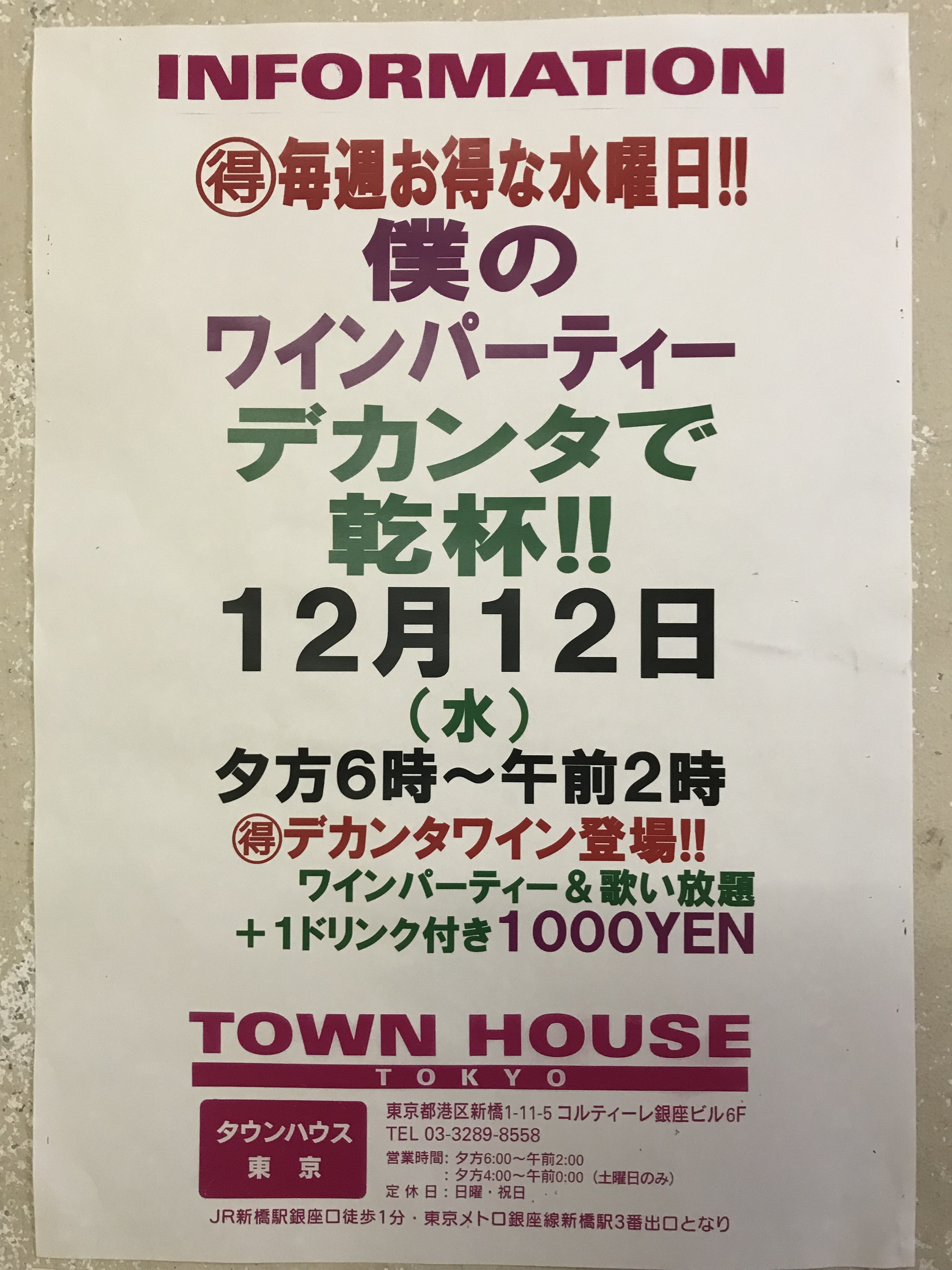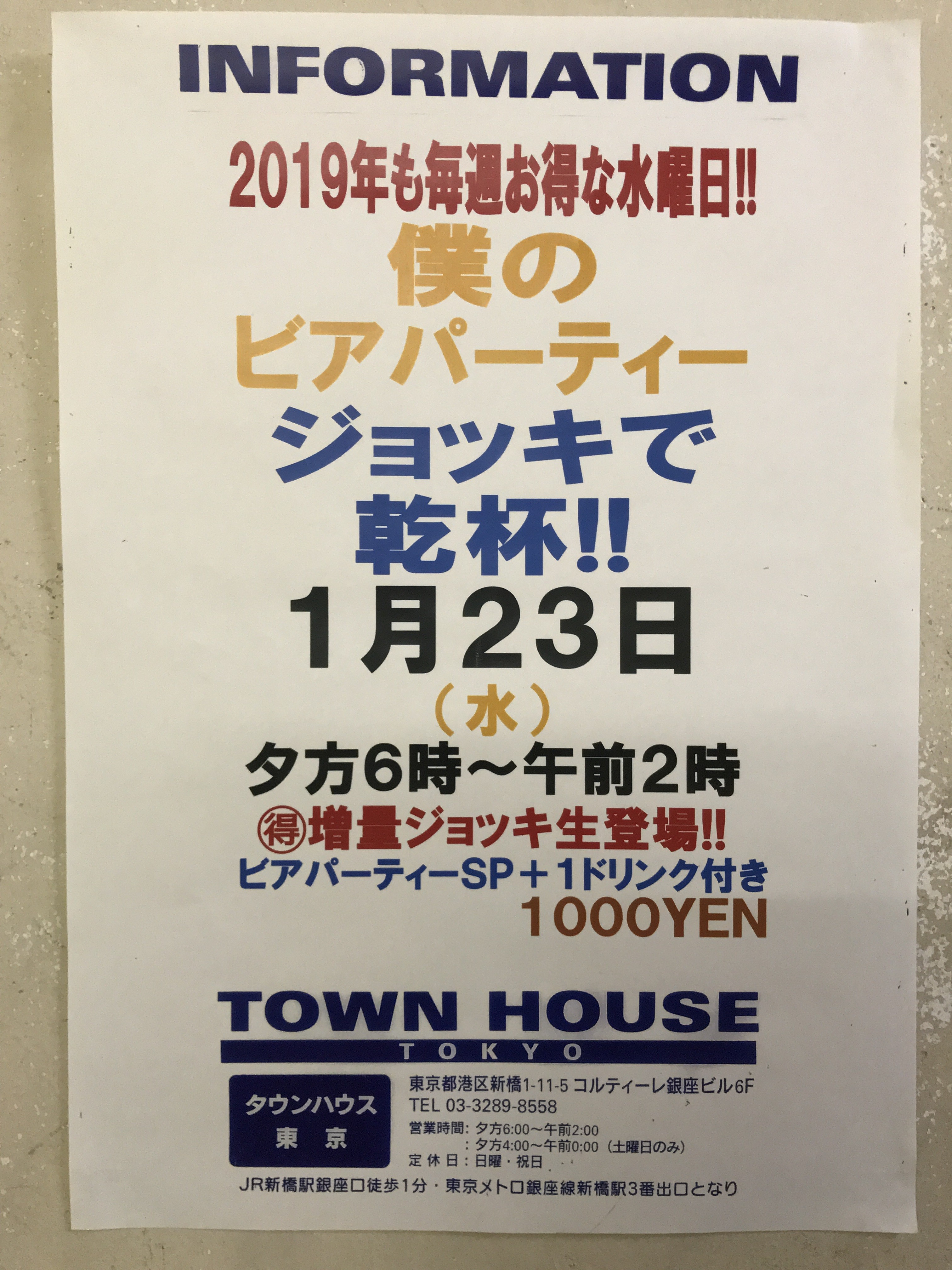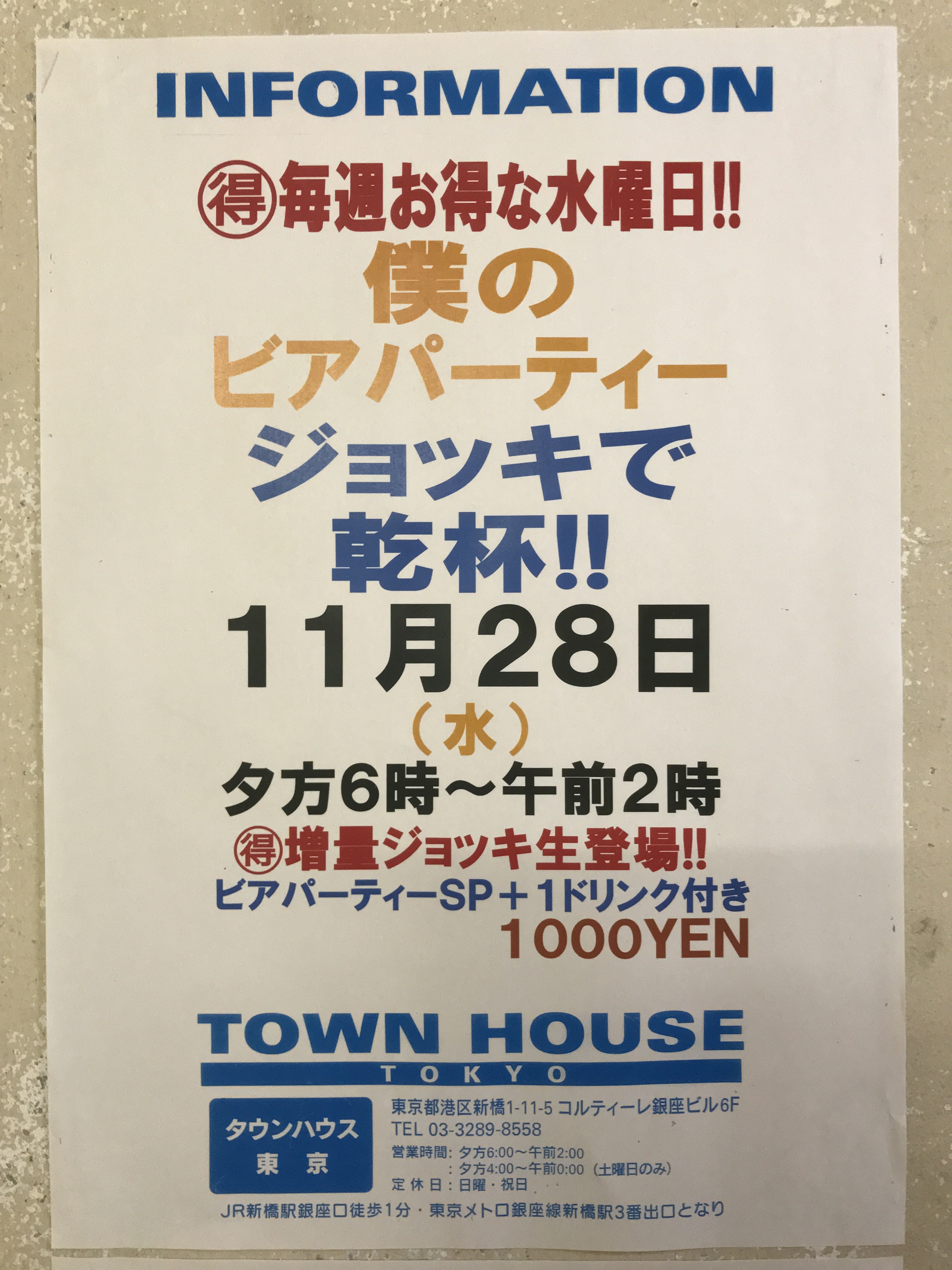 只今、午後2時。お昼休みの後、ちょっと眠くなってくる昼下がり。もうひと頑張りして、今夜は、是非、NO残業で、タウンハウスへ、新橋へ。
