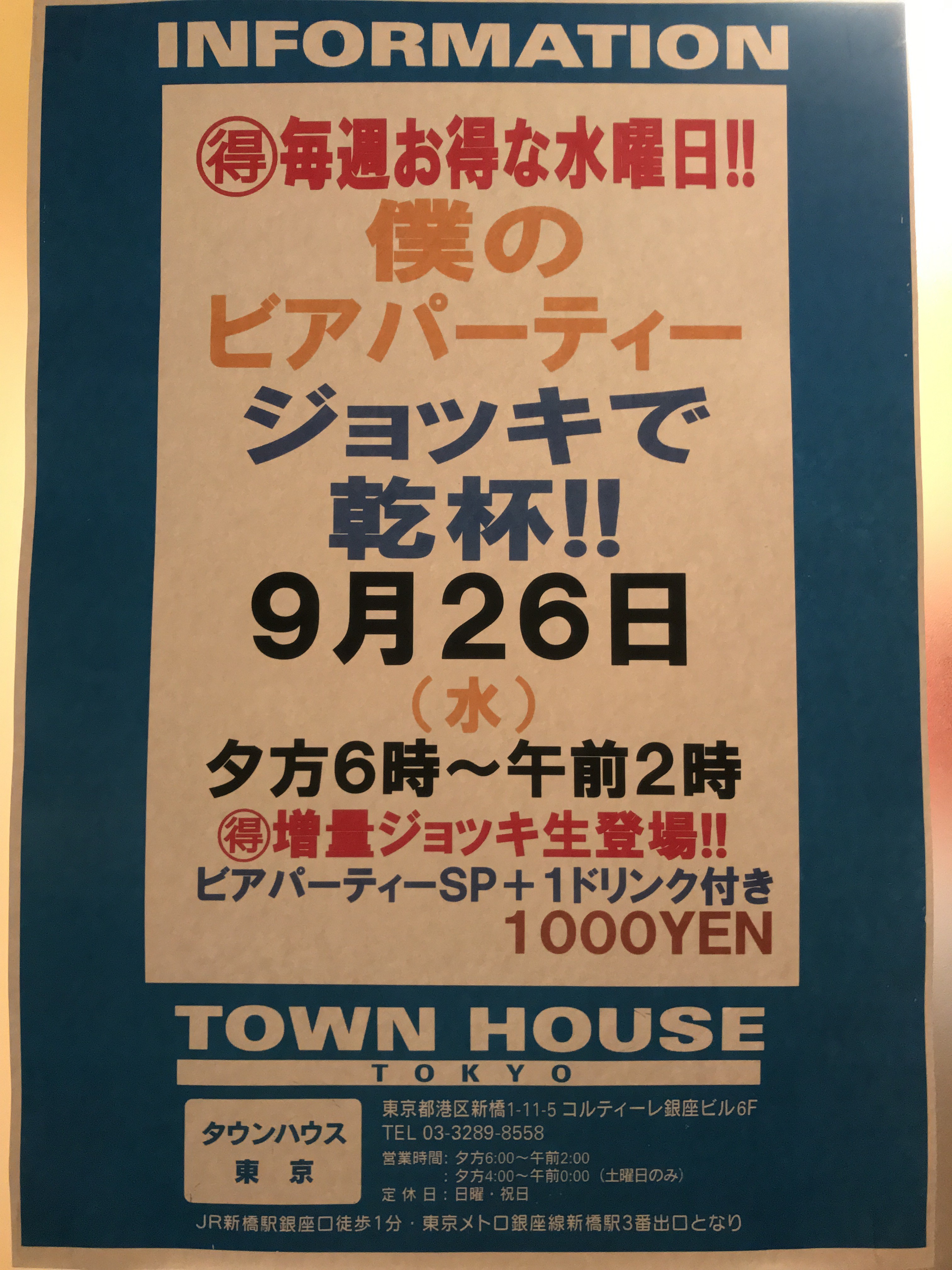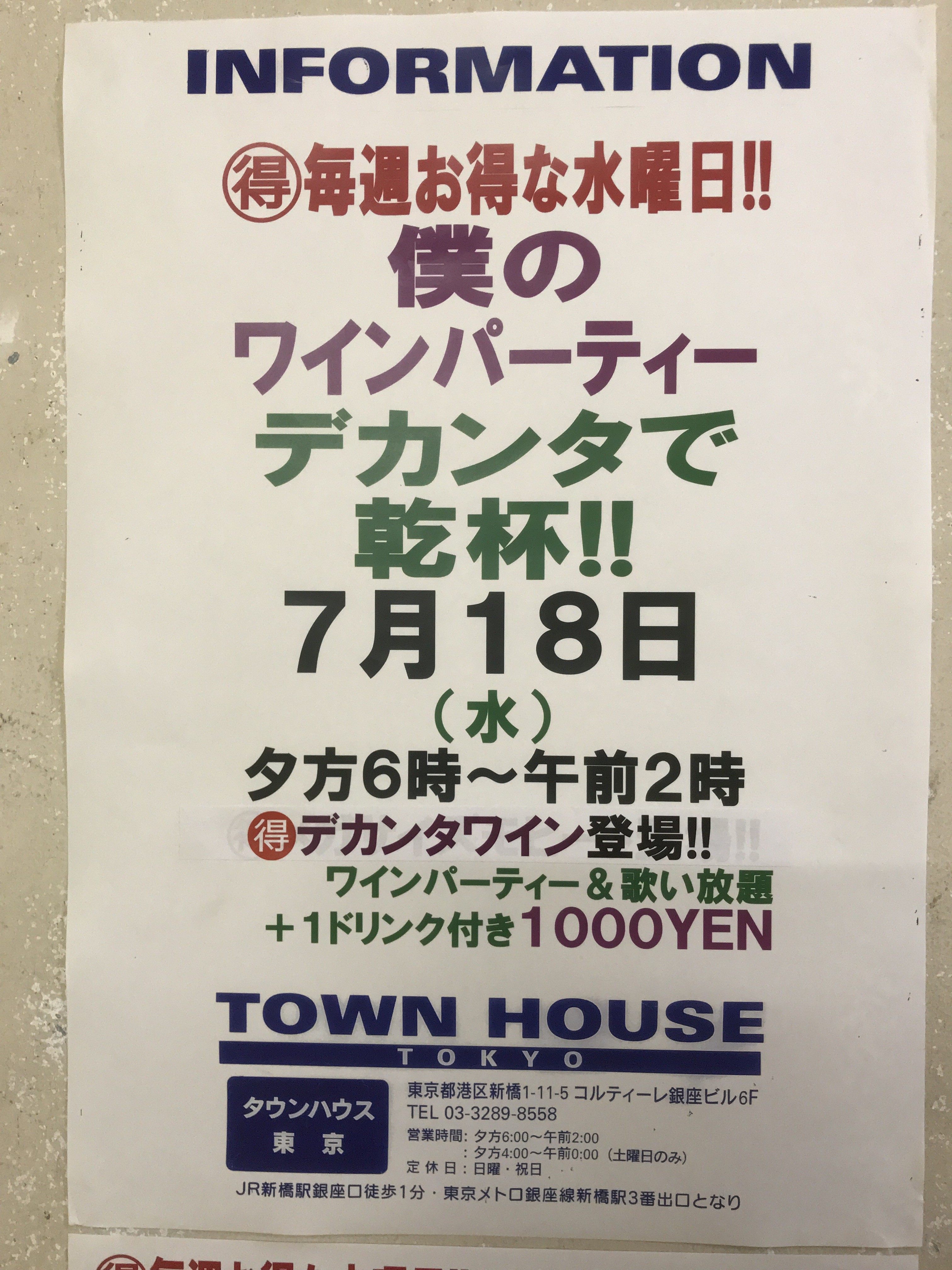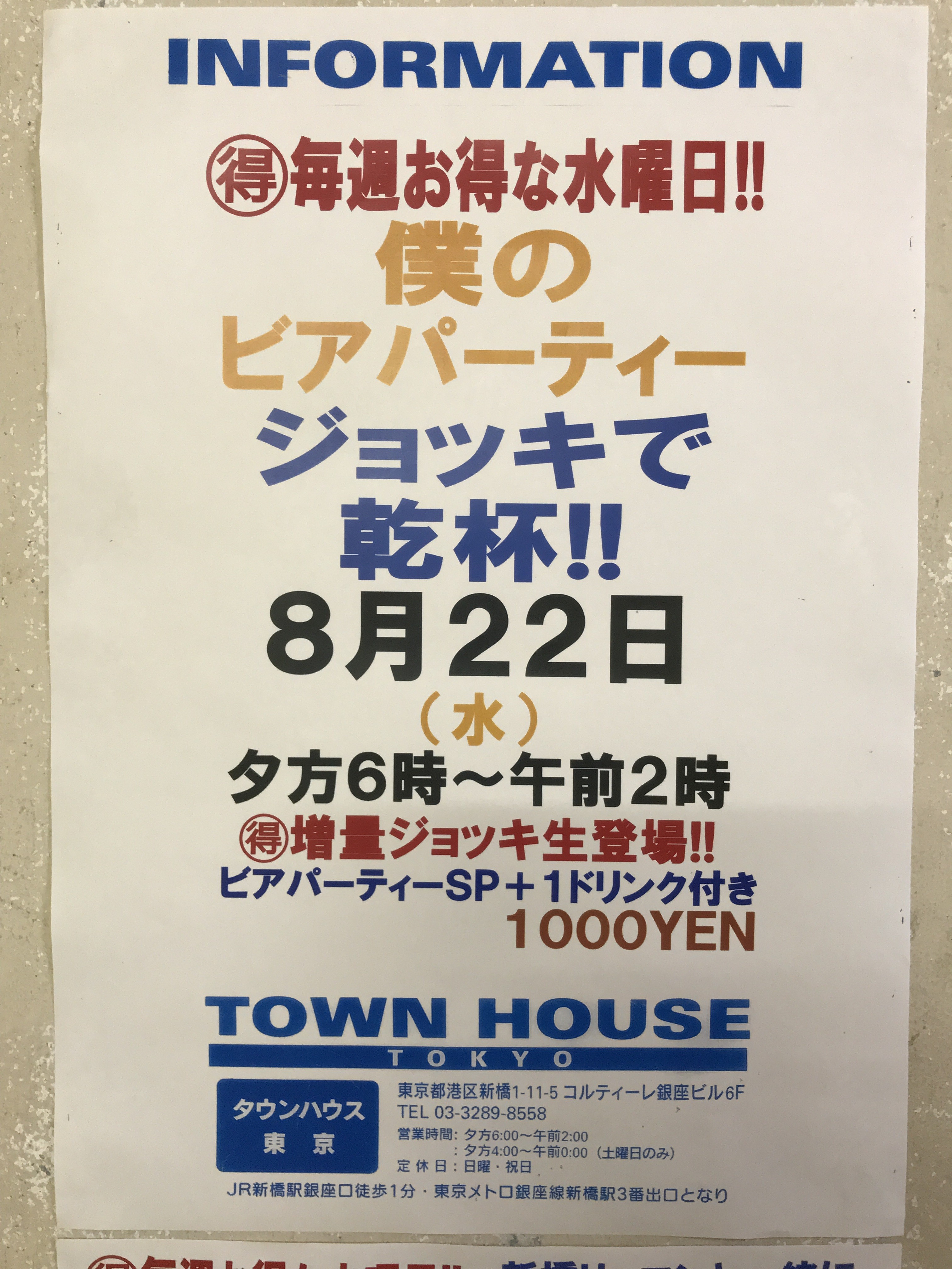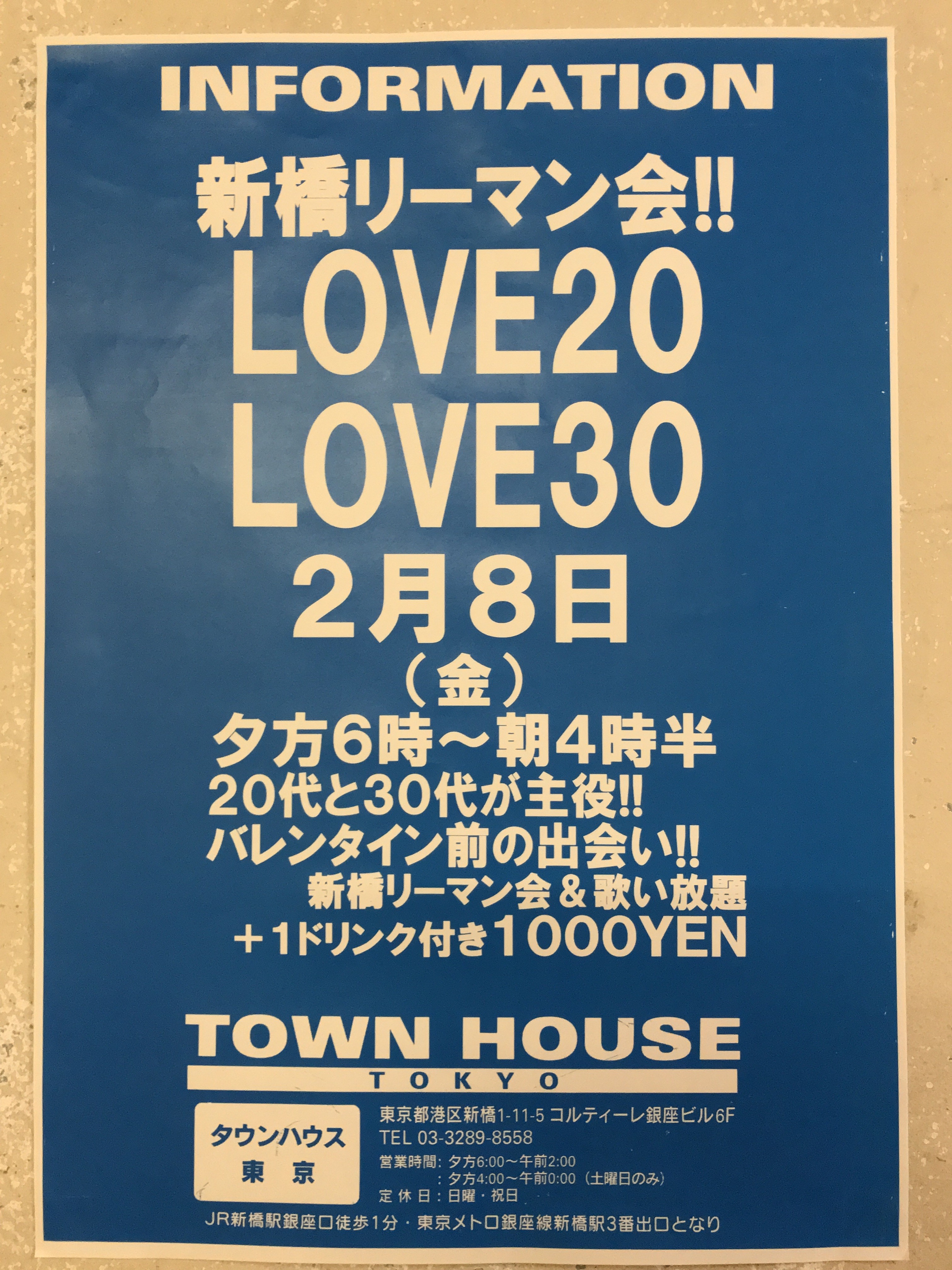 只今、午後2時。お昼休みの後、ちょっと眠くなってくる昼下がり。もうひと頑張りして、今夜は、是非、NO残業で、タウンハウスへ、新橋へ。