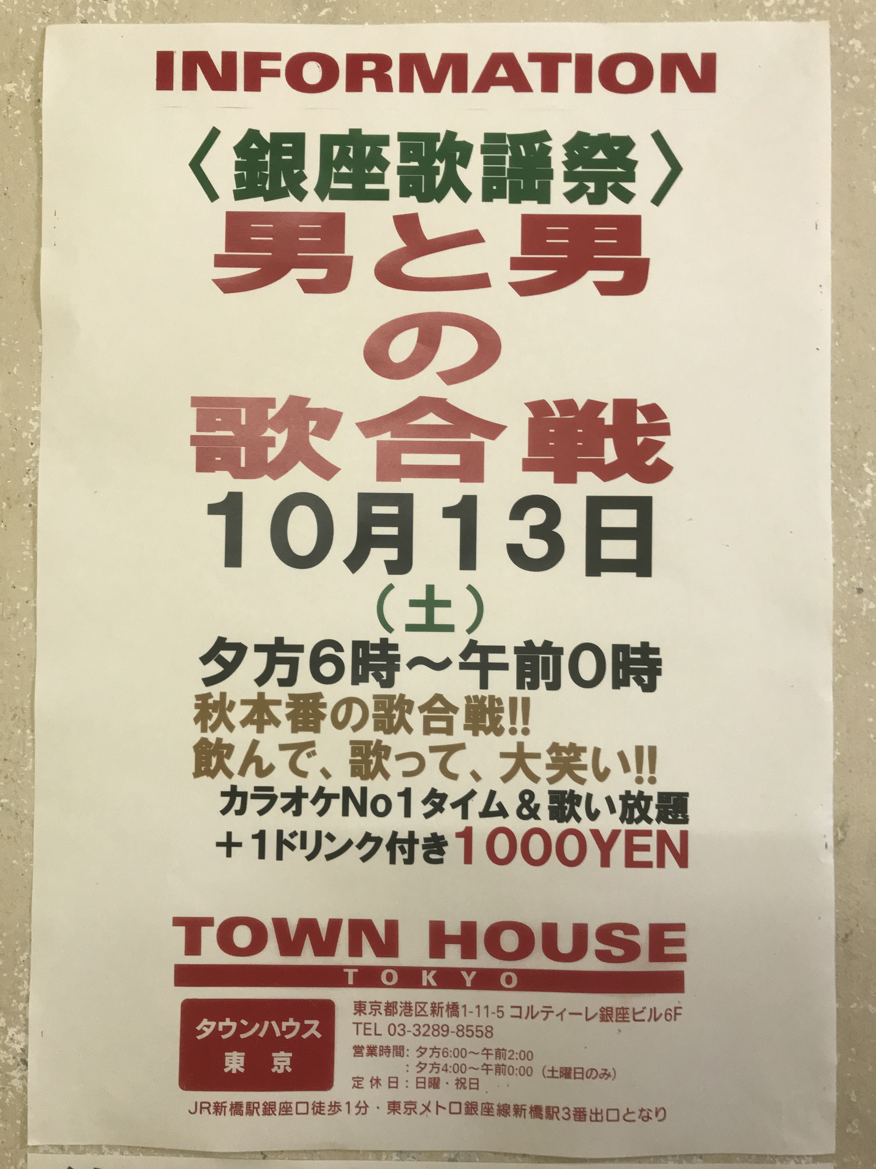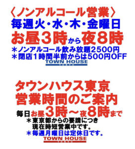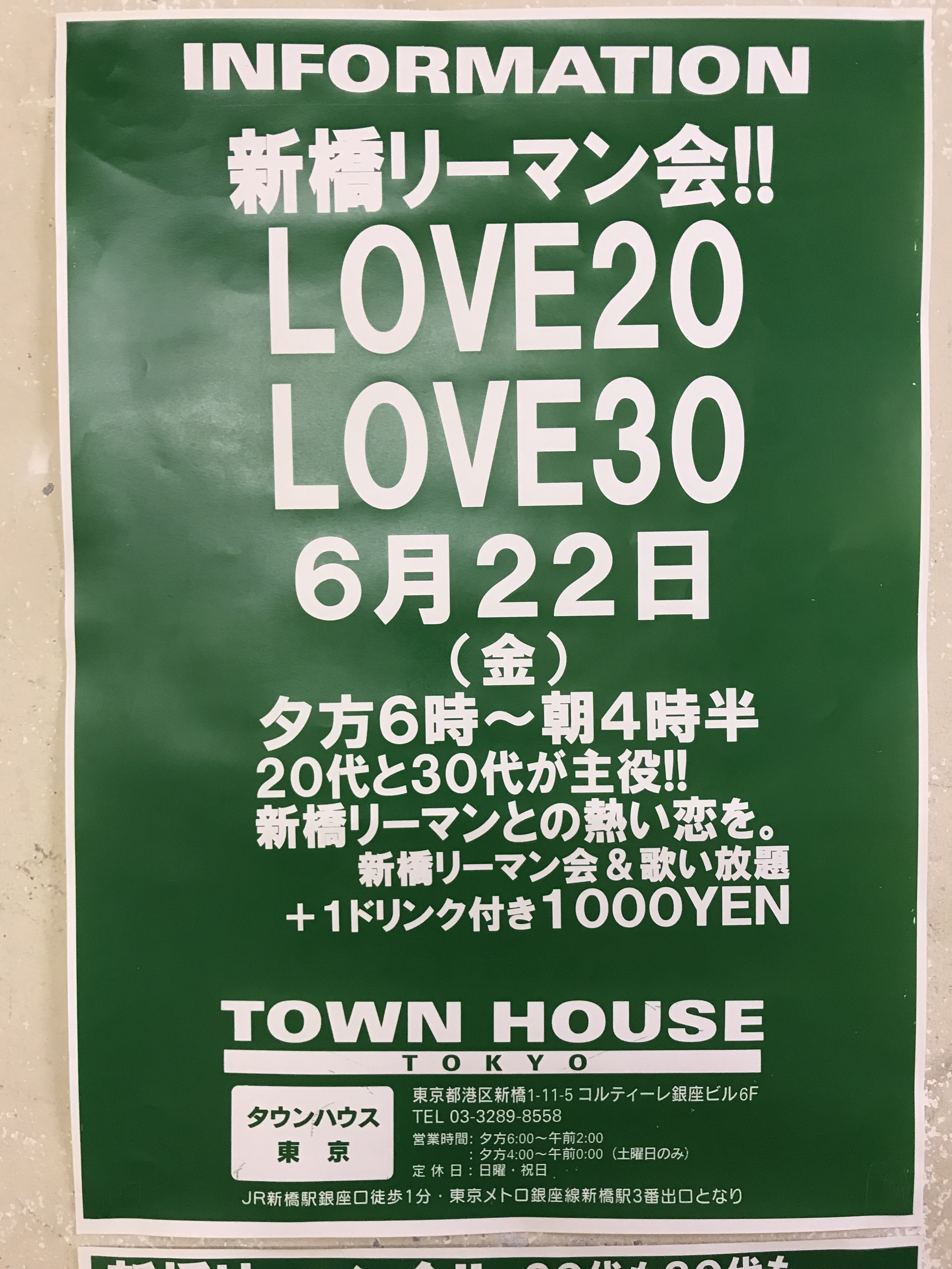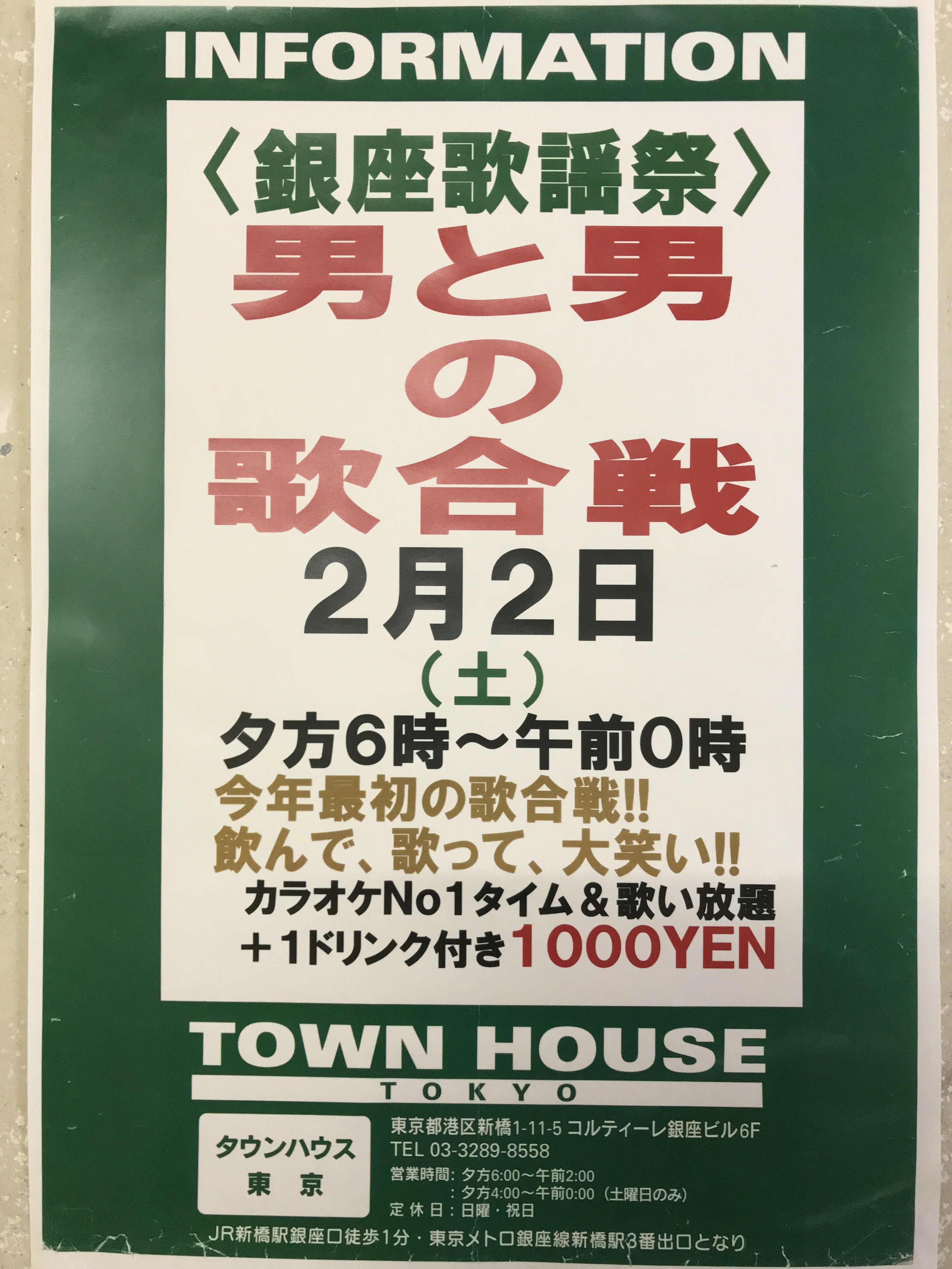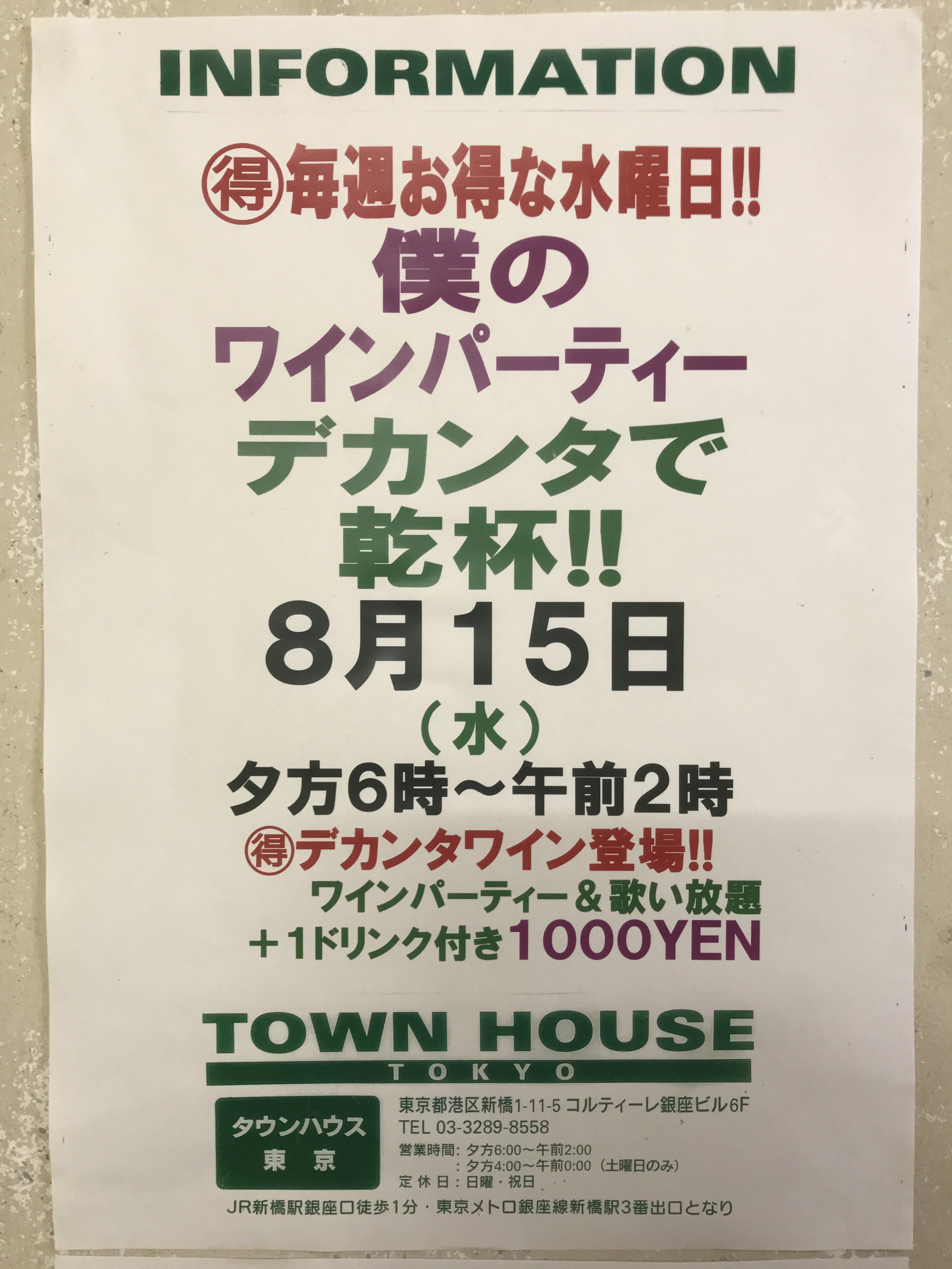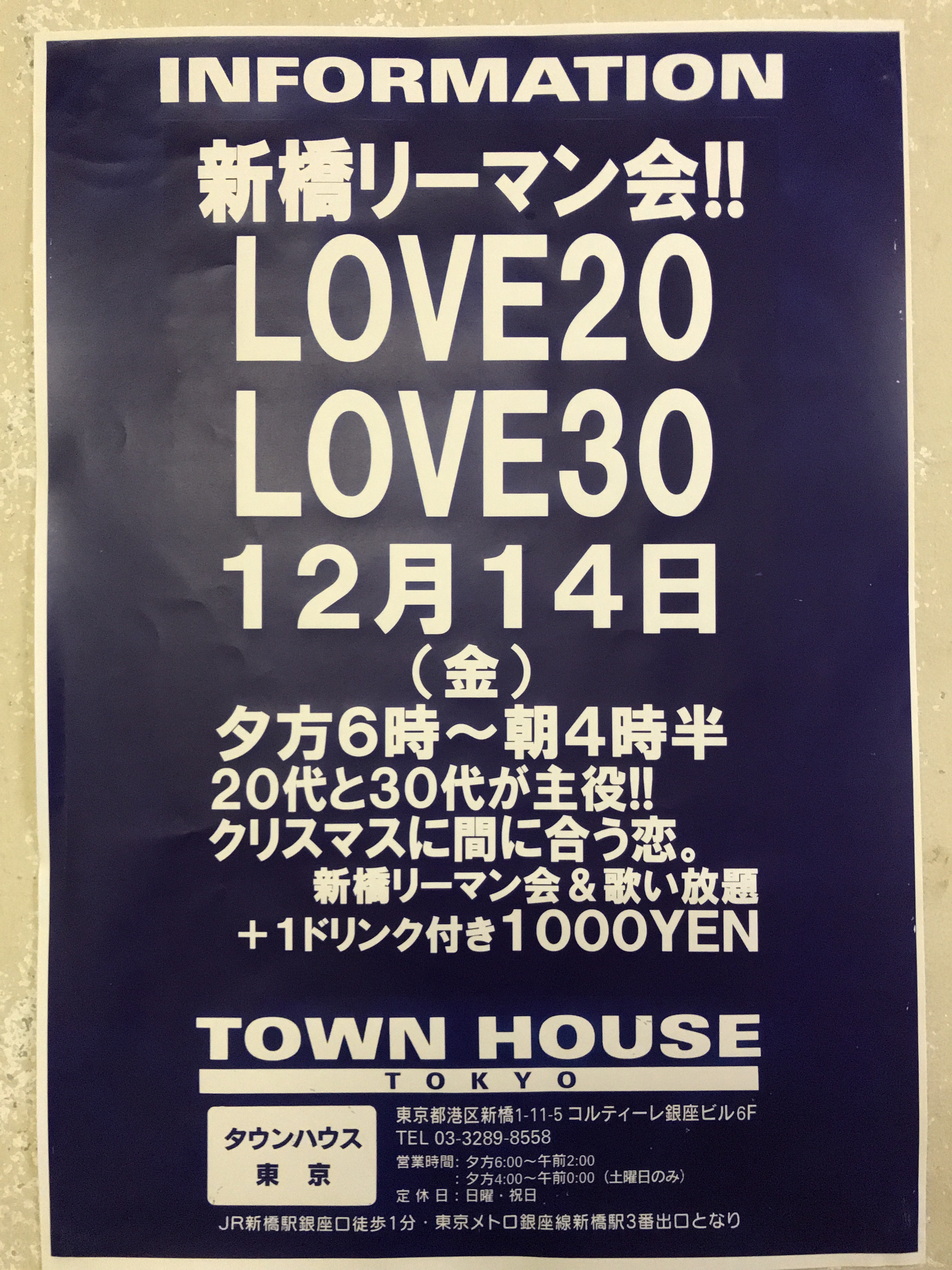 只今、午後2時。お昼休みの後、ちょっと眠くなってくる昼下がり。もうひと頑張りして、今夜は、是非、NO残業で、タウンハウスへ、新橋へ。