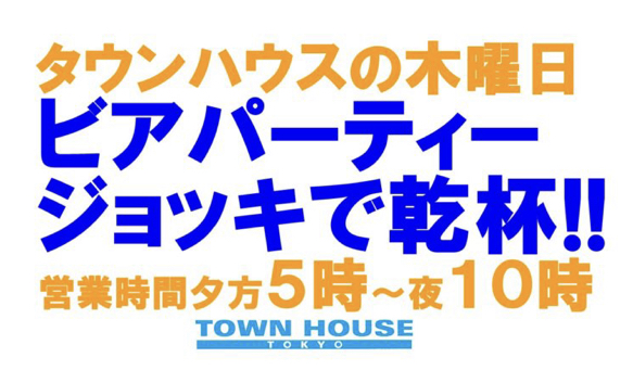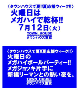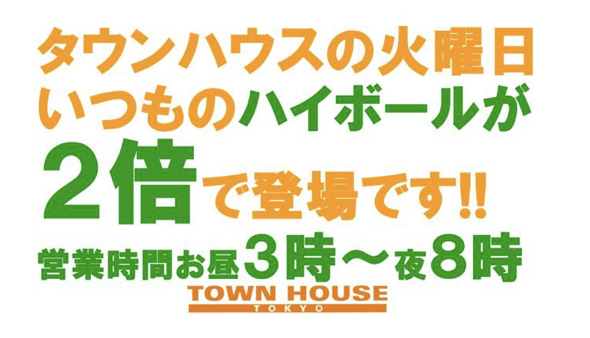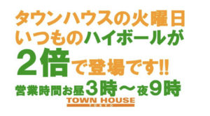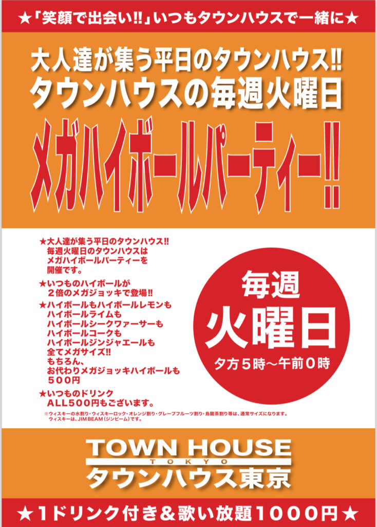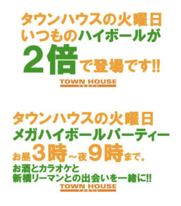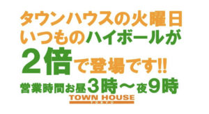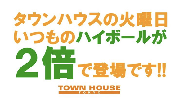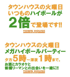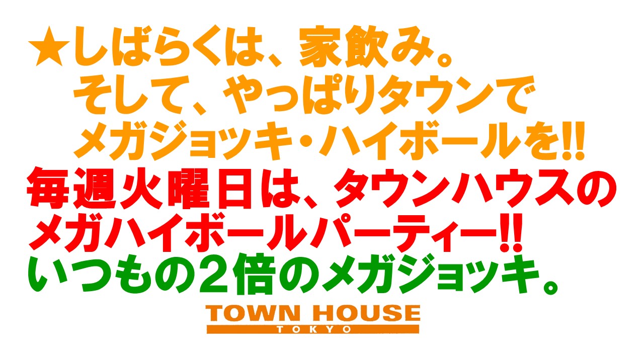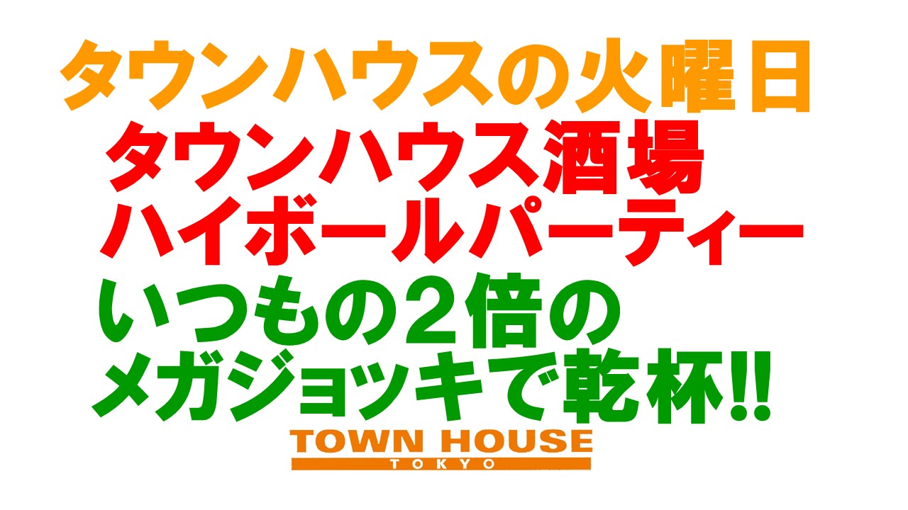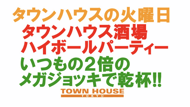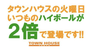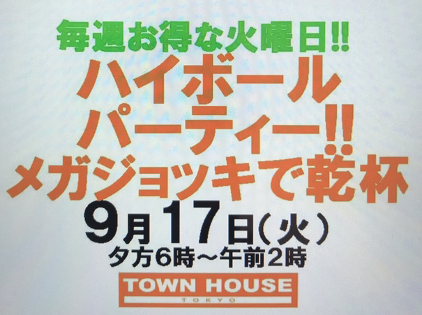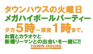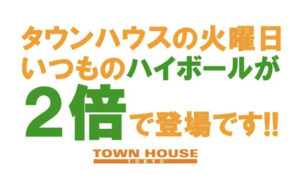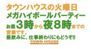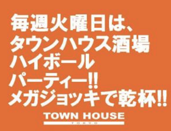 毎週、水曜日の超お得なタウンハウス。今夜は、いつものハイボールが、2倍のメガサイズで登場の、「僕のハイボールパーティー、メガジョッキで乾杯!!」