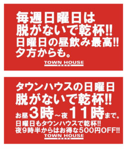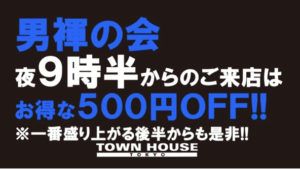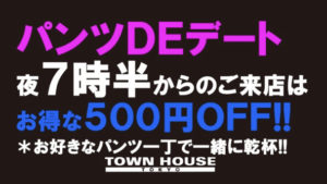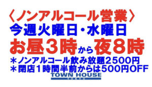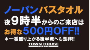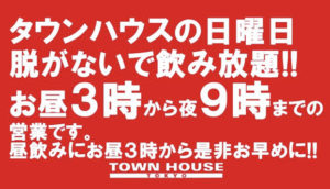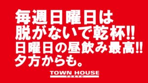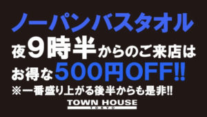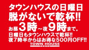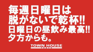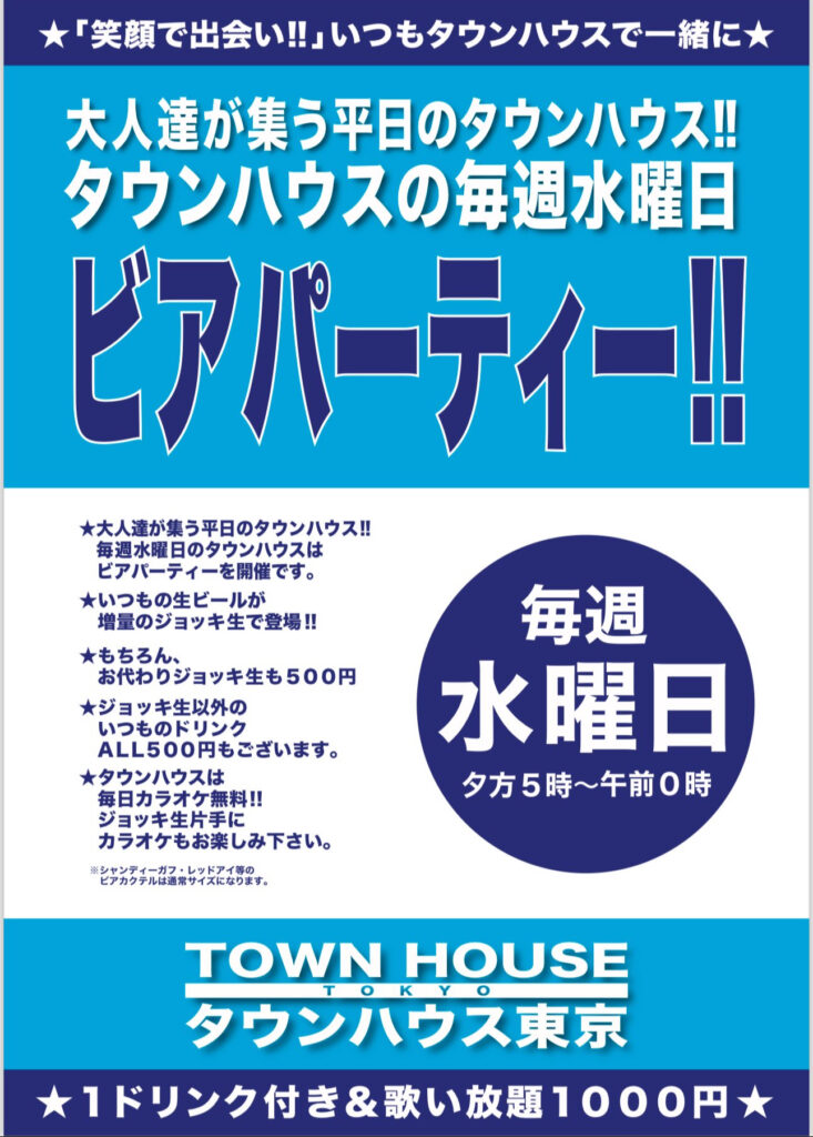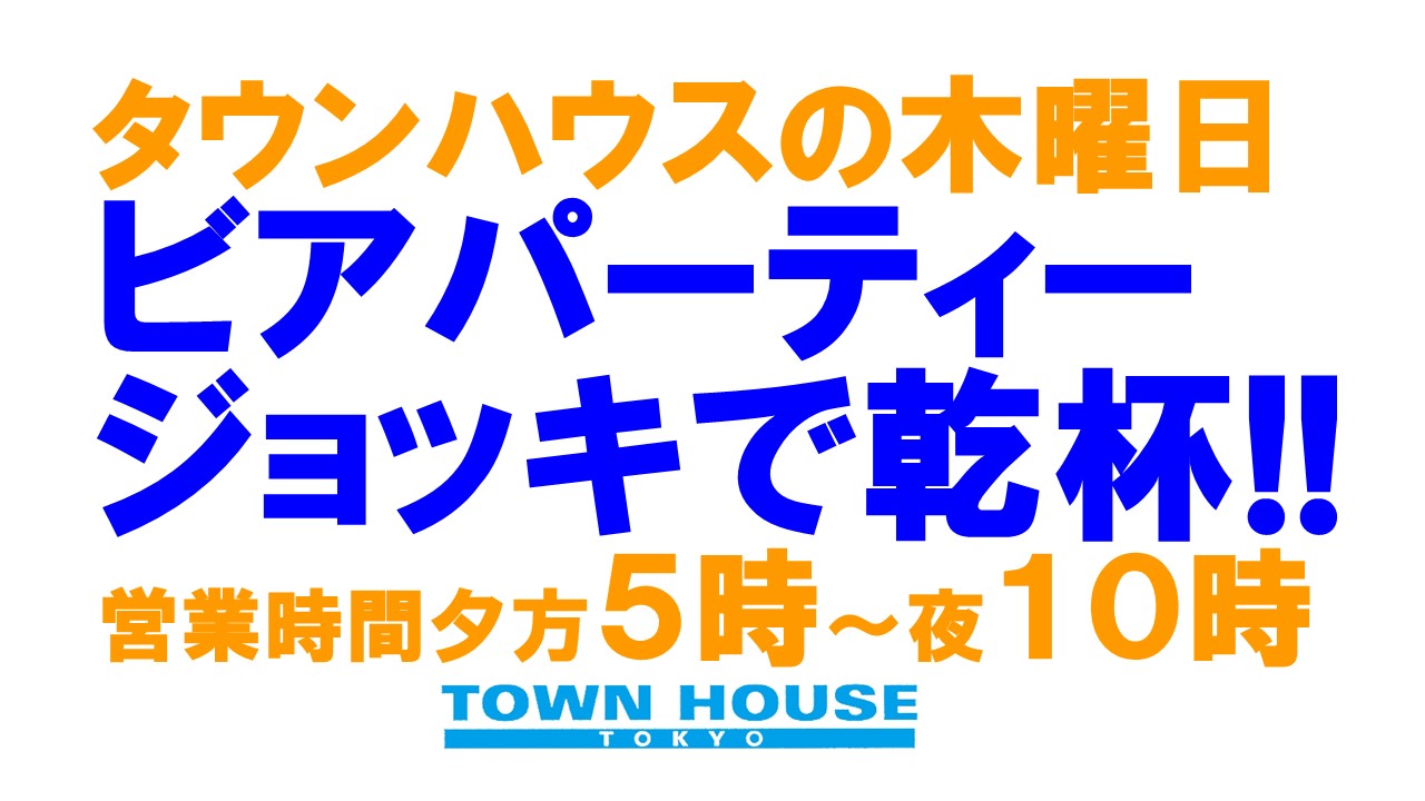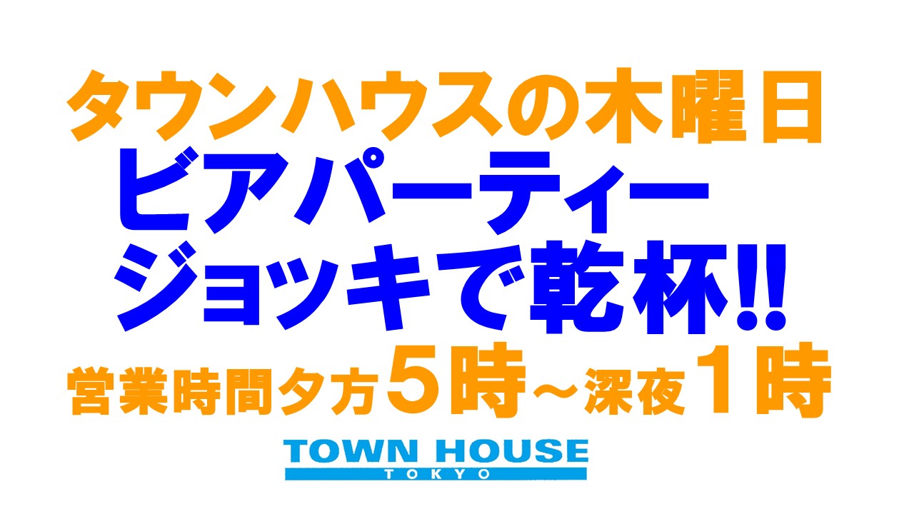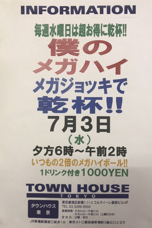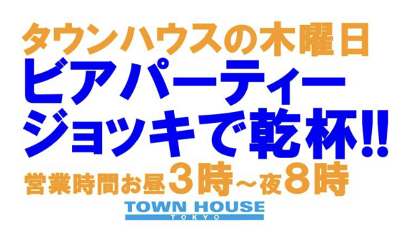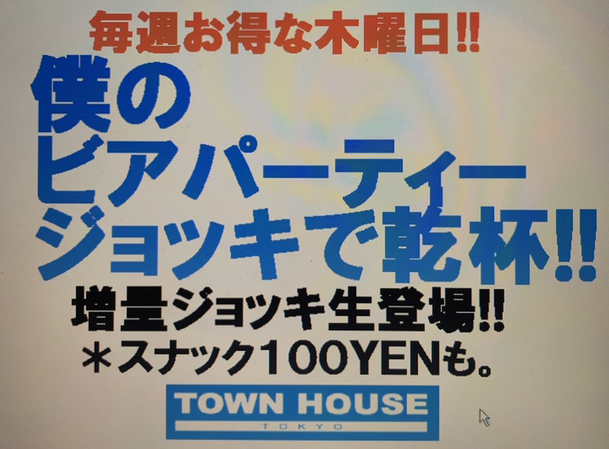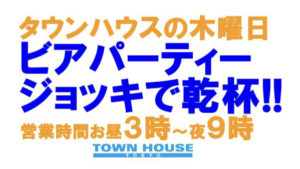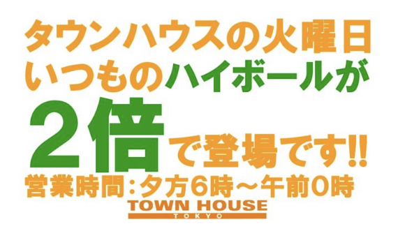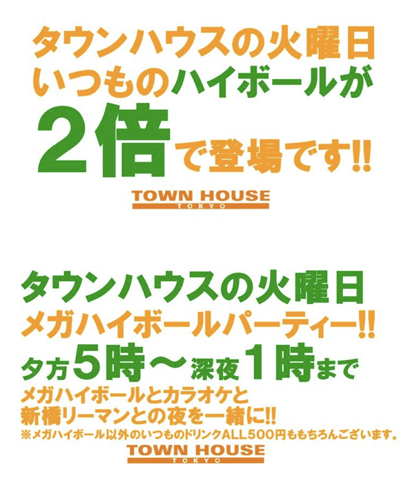 毎週、水曜日の超お得なタウンハウス。今夜は、いつものハイボールが、2倍のメガサイズで登場の、「僕のハイボールパーティー、メガジョッキで乾杯!!」