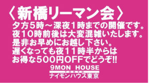 夕べも初めましての方も沢山来て頂きましたが、ピーク時間帯よりも早い8時半頃までにご来店頂けたら、スタッフとの会話、新橋リーマンとの出会いのきっかけもサポート出来ますので、ぜひ、早めにお越し下さい。