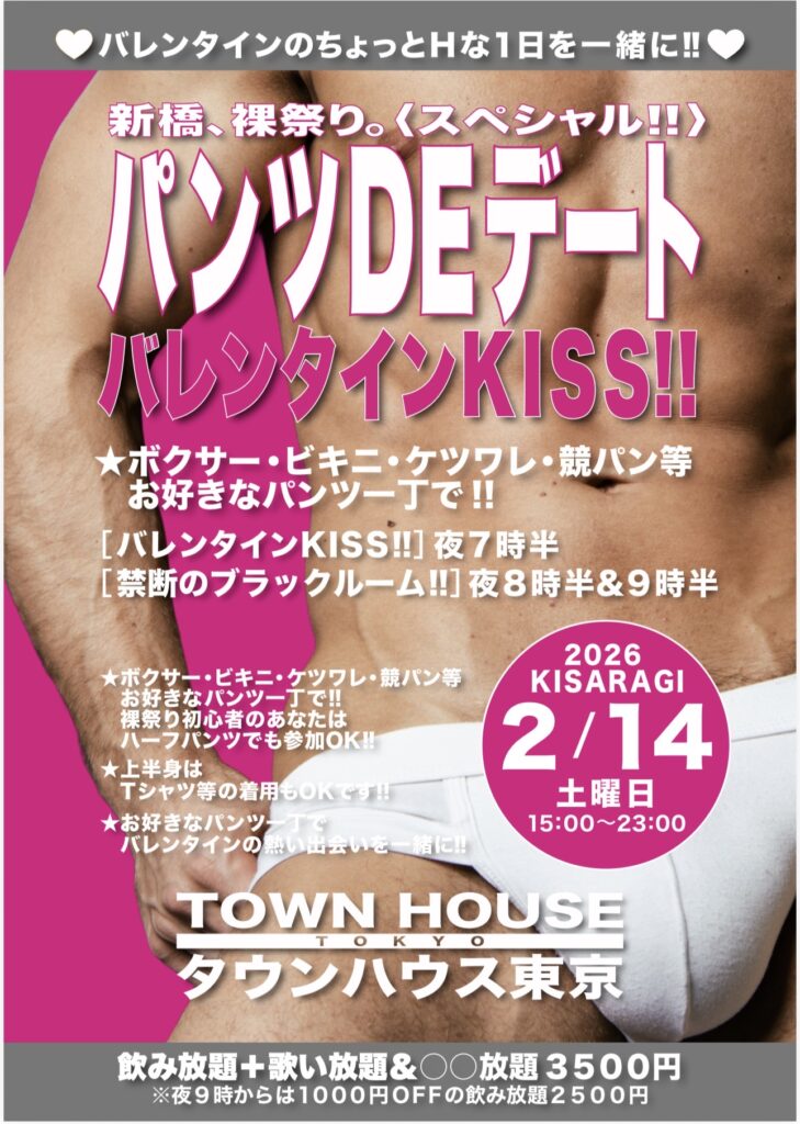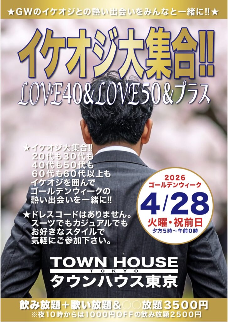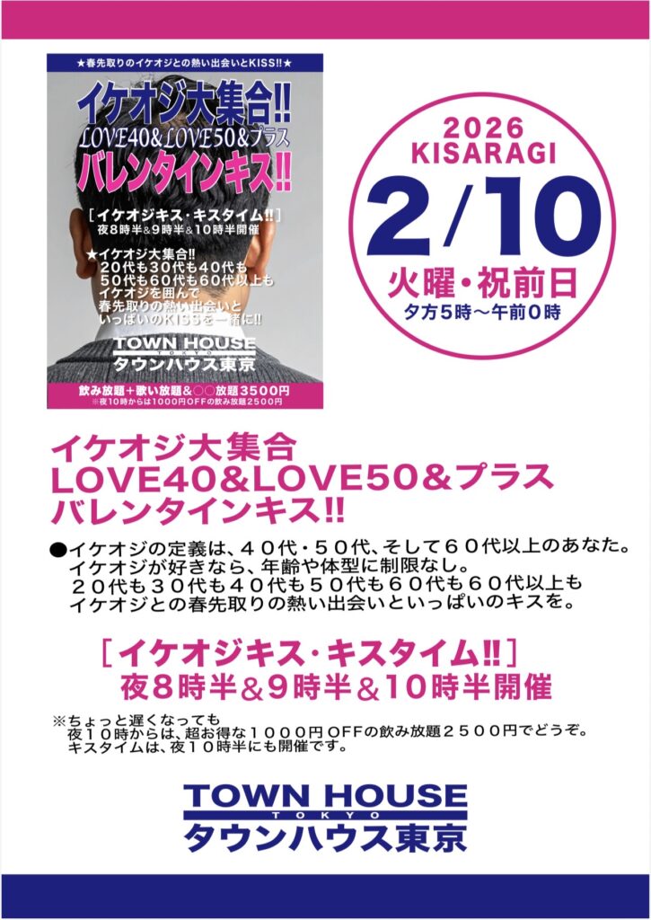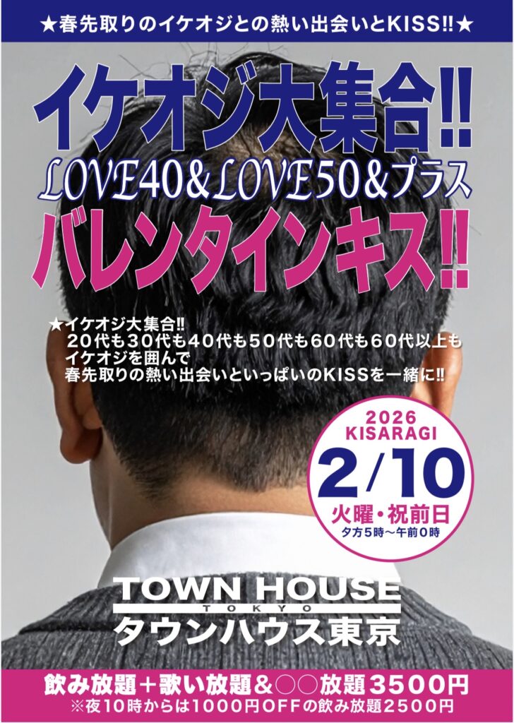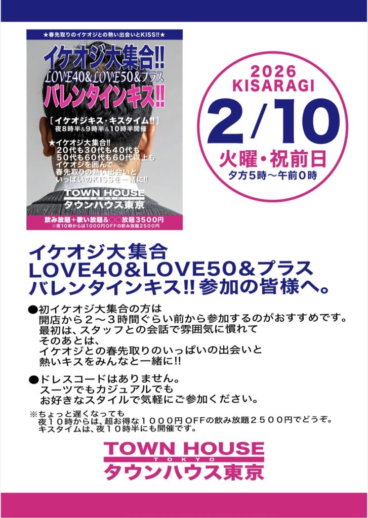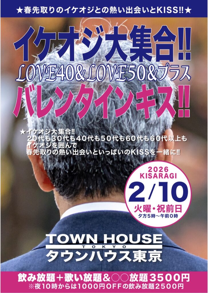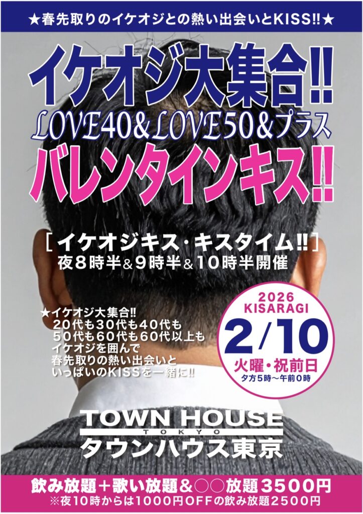 ⭐️来週・祝前日・2月10日(火㊗️前日)のタウンハウスは、イケオジ大集合‼️LOVE40&LOVE50&プラスバレンタインキス‼️を開催です。